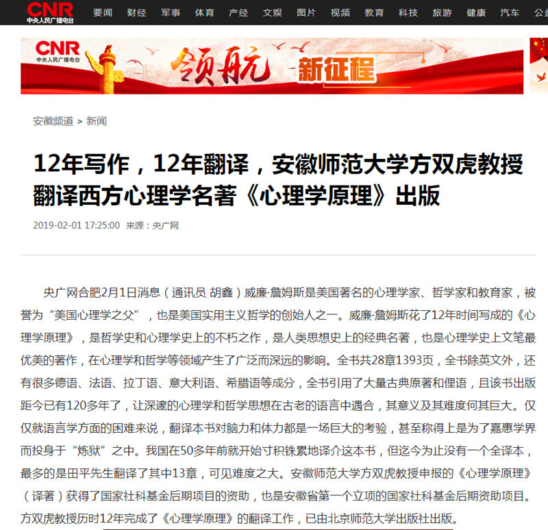 威廉·詹姆斯是美国著名的心理学家、哲学家和教育家,被誉为“美国心理学之父”,也是美国实用主义哲学的创始人之一。威廉·詹姆斯花了12年时间写成的《心理学原理》,是哲学史和心理学史上的不朽之作,是人类思想史上的经典名著,也是心理学史上文笔最优美的著作,在心理学和哲学等领域产生了广泛而深远的影响。全书共28章1393页,全书除英文外,还有很多德语、法语、拉丁语、意大利语、希腊语等成分,全书引用了大量古典原著和俚语,且该书出版距今已有120多年了,让深邃的心理学和哲学思想在古老的语言中遇合,其意义及其难度何其巨大。仅仅就语言学方面的困难来说,翻译本书对脑力和体力都是一场巨大的考验,甚至称得上是为了嘉惠学界而投身于“炼狱”之中。我国在50多年前就开始寸积铢累地译介这本书,但迄今为止没有一个全译本,最多的是田平先生翻译了其中13章,可见难度之大。安徽师范大学方双虎教授申报的《心理学原理》(译著)获得了国家社科基金后期项目的资助,也是安徽省第一个立项的国家社科基金后期资助项目。方双虎教授历时12年完成了《心理学原理》的翻译工作,已由北京师范大学出版社出版。