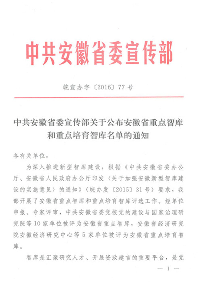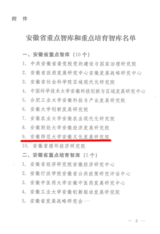 近年来,学校高度重视智库建设,坚持问题导向,瞄准重大问题和国家、区域经济社会发展需求,发挥智库服务地方经济社会发展积极作用,“安徽文化发展研究院”入选安徽省重点智库是继学校获批“安徽旅游发展研究中心”和“安徽教育发展研究中心”2个省级智库建设项目之后的又一重大突破。