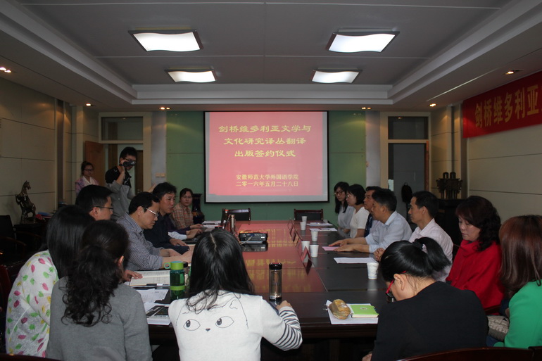 (本网讯,外国语学院 胡婷婷)5月28日下午《剑桥维多利亚文学与文化研究》译丛签约仪式在安徽师范大学外国语学院会议室举行。出席签约仪式的有江苏凤凰出版传媒股份有限公司副总经理译林出版社总编辑刘锋先生、译林出版社人文社科出版中心主任陈叶女士、译林出版社人文社科出版中心编辑刘静女士、校科研处处长陆林教授、副处长戴兆国教授、办公室主任谭书龙老师、外国语学院领导、丛书主编蔡玉辉教授、编委会成员、试译教师、试译稿审阅专家、翻译方向部分研究生等。外国语学院院长丛书主编之一张德让教授主持了签约仪式。