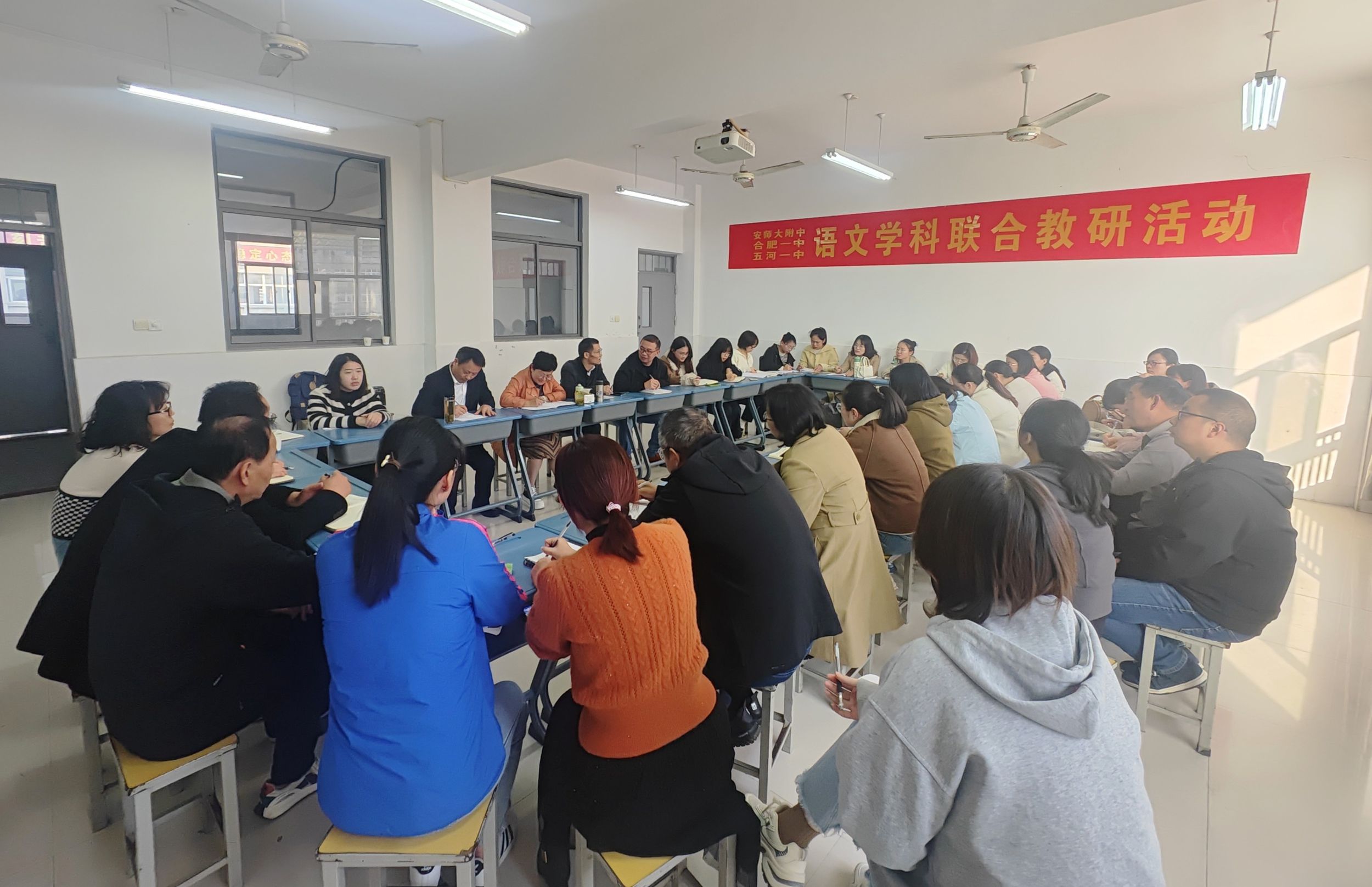 加强校际联动,促进教研协同,实现优质资源共学共享、共研共进。10月24日,教育集团邀请合肥市学科带头人、合肥一中语文学科组主任、高级教师汪梅林为五河一中高三学子作“高考作文入格指津”专题讲座,汪梅林现场分享了自己的作文教学和阅卷经验。附属中学语文教研组严景东、夏吉中与合肥一中、五河一中语文教研组的老师开展联合教研座谈,对语文培优、语文教考衔接等热点问题进行深度探讨。