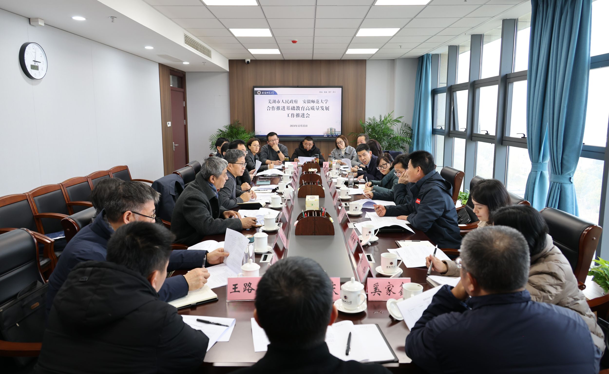 12月25日下午,芜湖市副市长朱的娥带领市教育局班子成员、相关科所、中学负责人等一行来校调研合作推进基础教育高质量发展相关工作。推进会在花津校区文典楼A925会议室举行。校党委常委、副校长曾黎明主持会议。校社会合作处、教育集团、音乐学院、美术学院、体育学院、“三附”等单位主要负责同志参加了会议。
