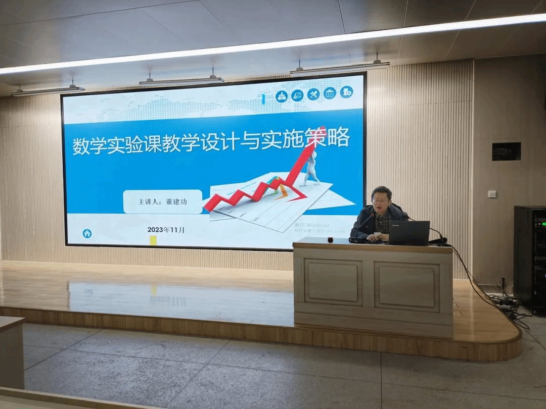 董建功教授以《数学实验课教学设计与实施策略》为主题给参会老师带来了精彩的讲座。董建功教授从“什么是数学实验”“数学实验的教育功能”以及“数学实验室”等方面对数学实验课的背景进行了相关介绍,强调了数学实验课实施的必要性,列举了大量实验教学案例,强调了数学实验课实施的可行性。同时通过相应课例对数学实验课教学设计、实施策略进行了醍醐灌顶的指导。最后,董建功教授提出“寻找研究特色,体现立德树人”的思考,用对仗的形式提出了几点意见,同时也表达了对所有数学教师上好数学实验课,从而培养学生数学核心素养及动手实验能力,团队合作能力的殷切希望。