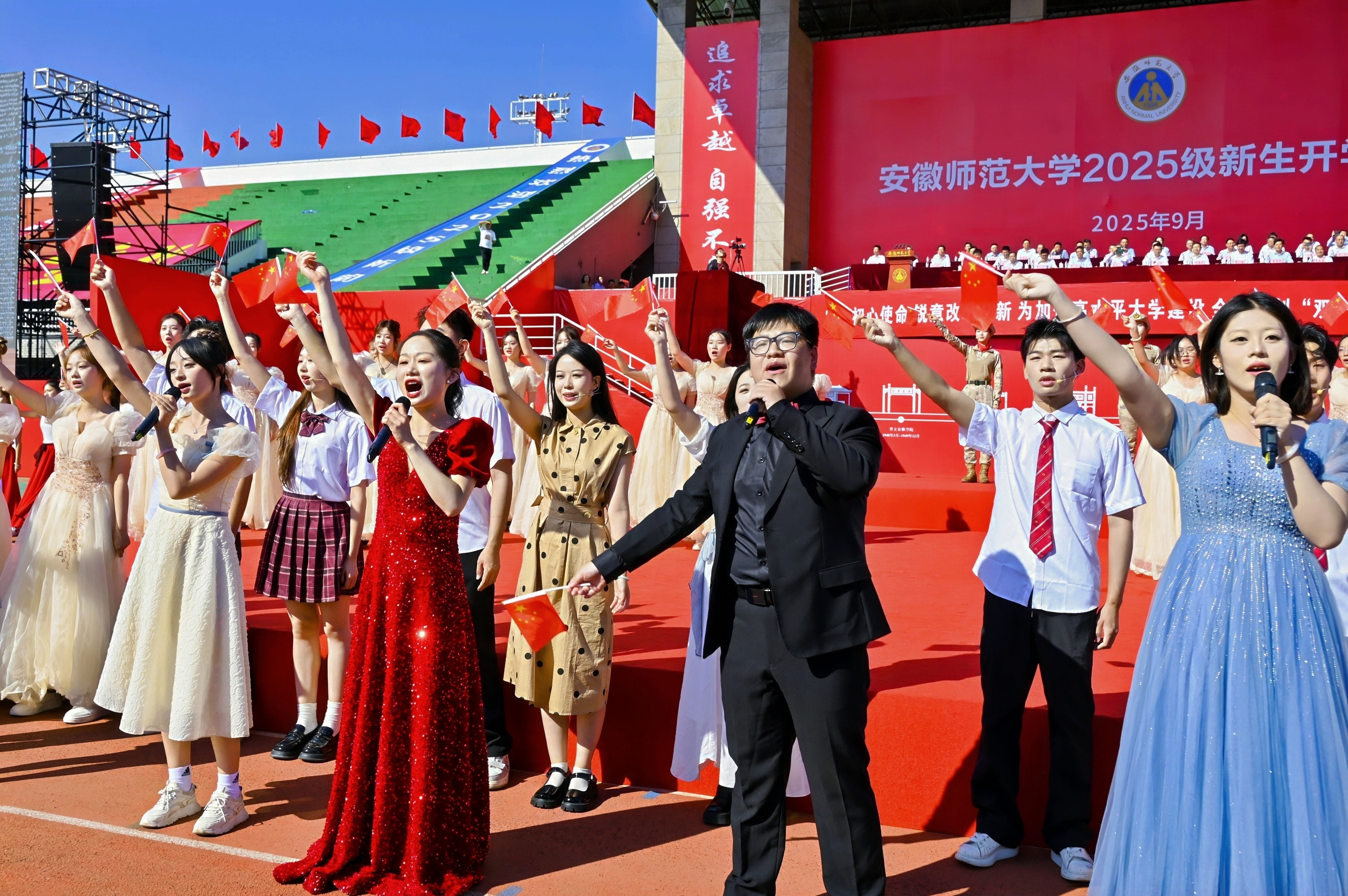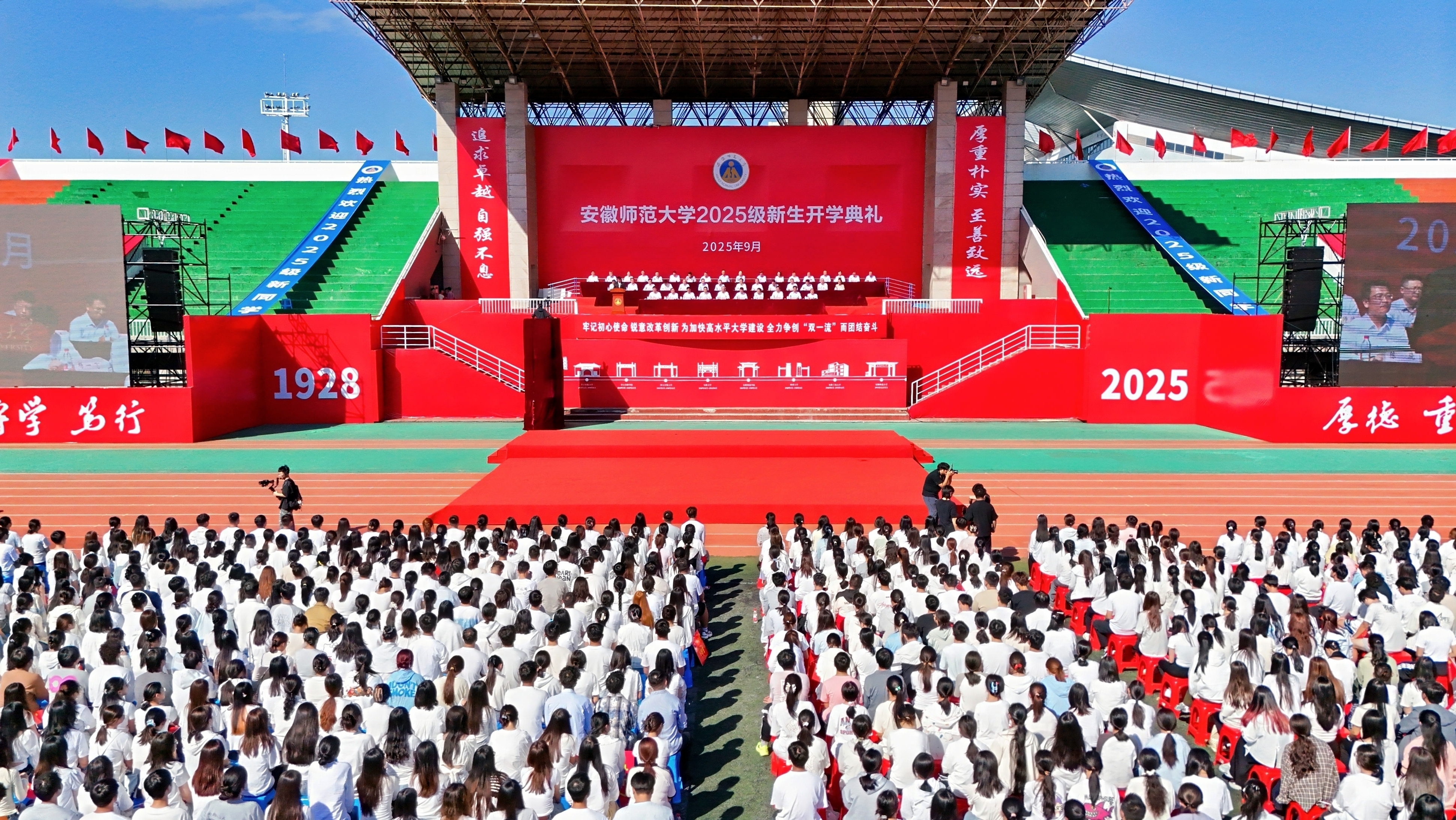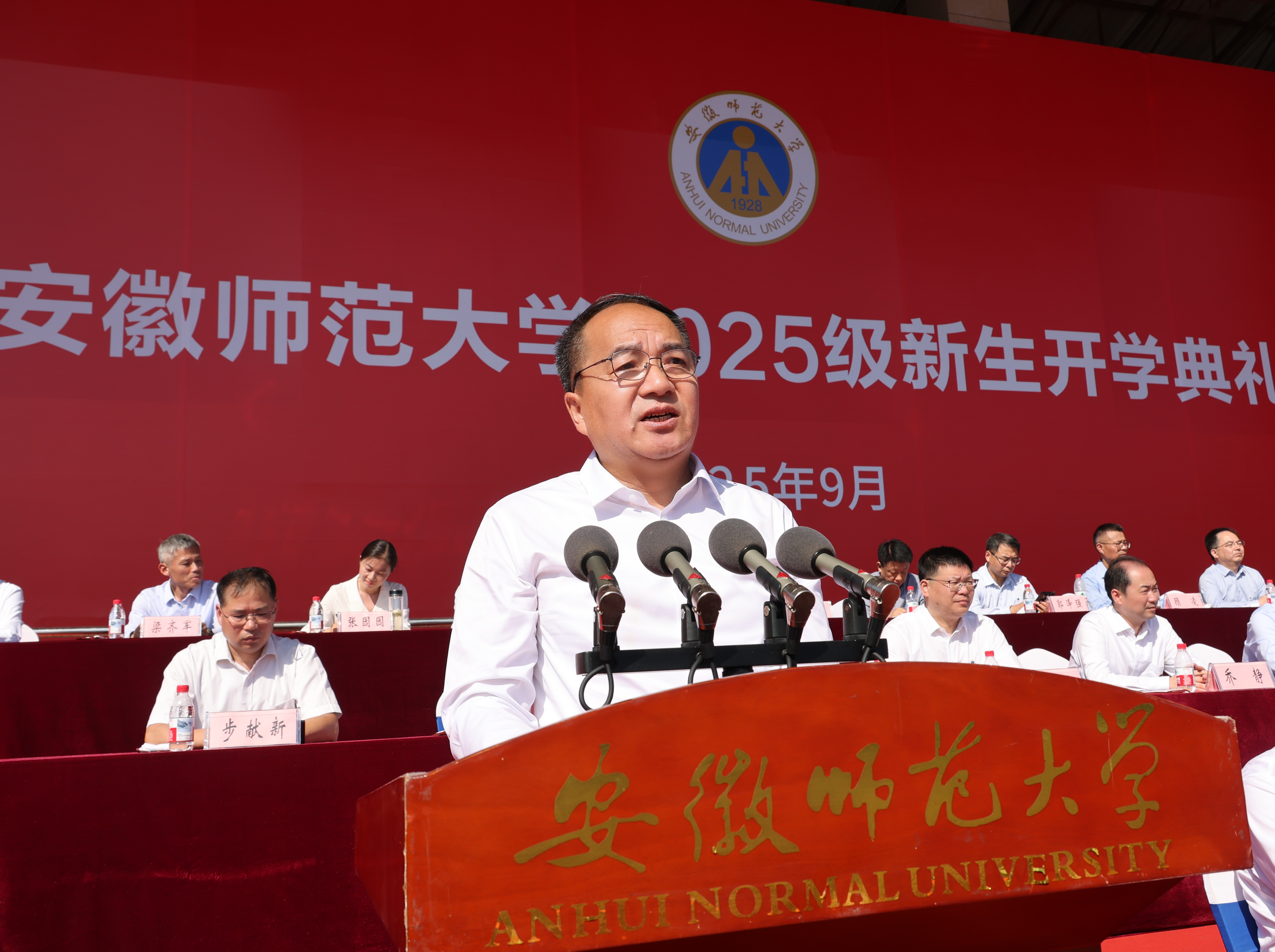 金秋时节,丹桂飘香。9月22日上午,安徽师范大学花津校区北侧田径场旌旗招展、青春涌动,学校2025级新生开学典礼在此隆重举行。1万2千余名新生意气风发、怀揣梦想,齐聚在这所近百年历史的学府,正式开启“师大人”砥砺奋进、追求卓越的崭新征程。校领导蒋家平、熊宇杰、曾黎明、高峰、胡靖、茆磊、桑青松、王刚出席典礼。国家杰出青年科学基金获得者、中国科学技术大学数学科学学院副院长、教授、博士生导师、我校1997届数学系校友王毅教授,我校生命科学学院教授、博士生导师、国家杰出青年科学基金获得者李枢强应邀出席并分别作为校友代表和教师代表发言。学校有关职能部门主要负责人,各学院主要负责人、分管负责人、教师代表、在校生代表、全体2025级新生和辅导员参加典礼。典礼由校党委书记蒋家平主持。