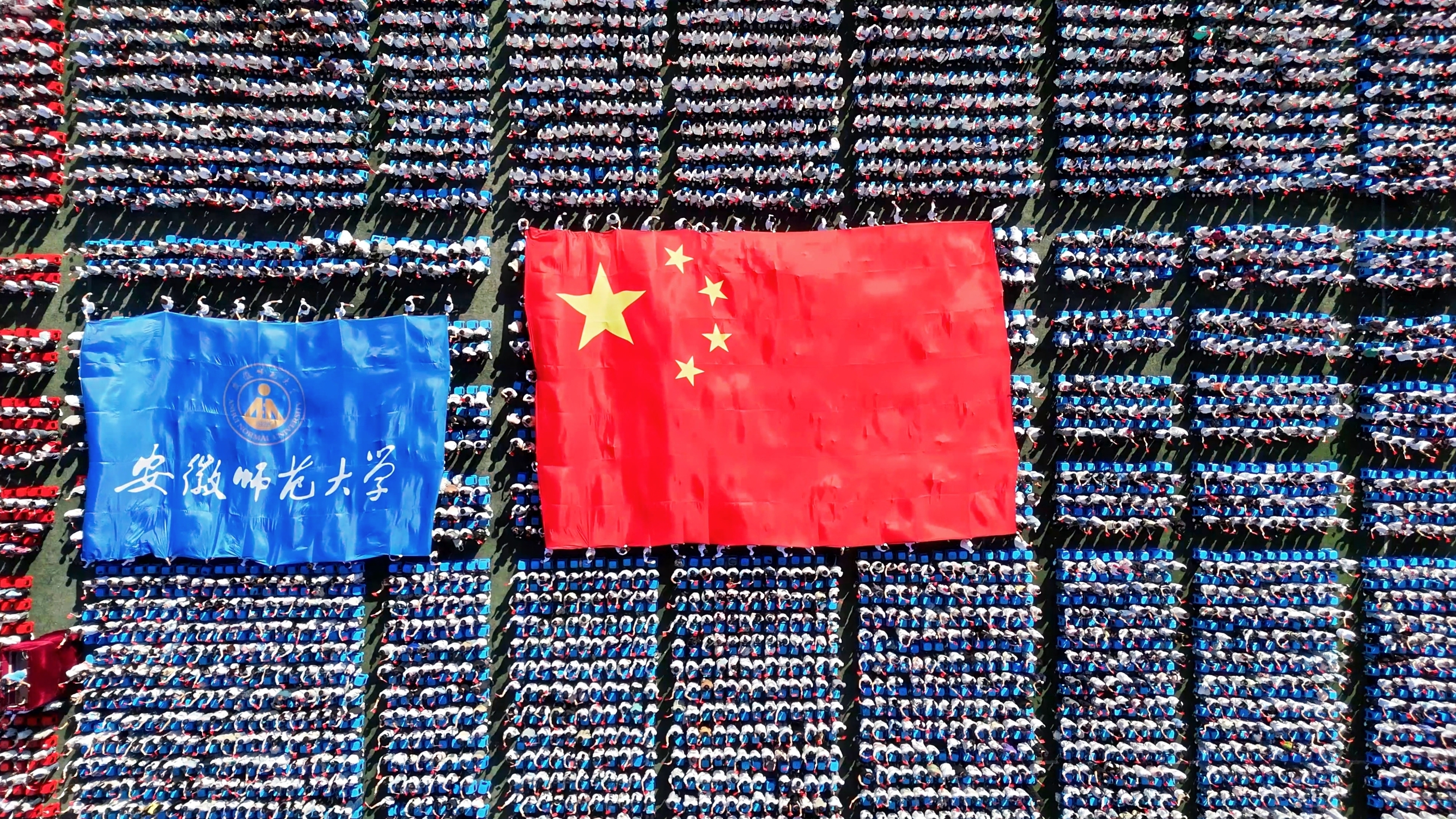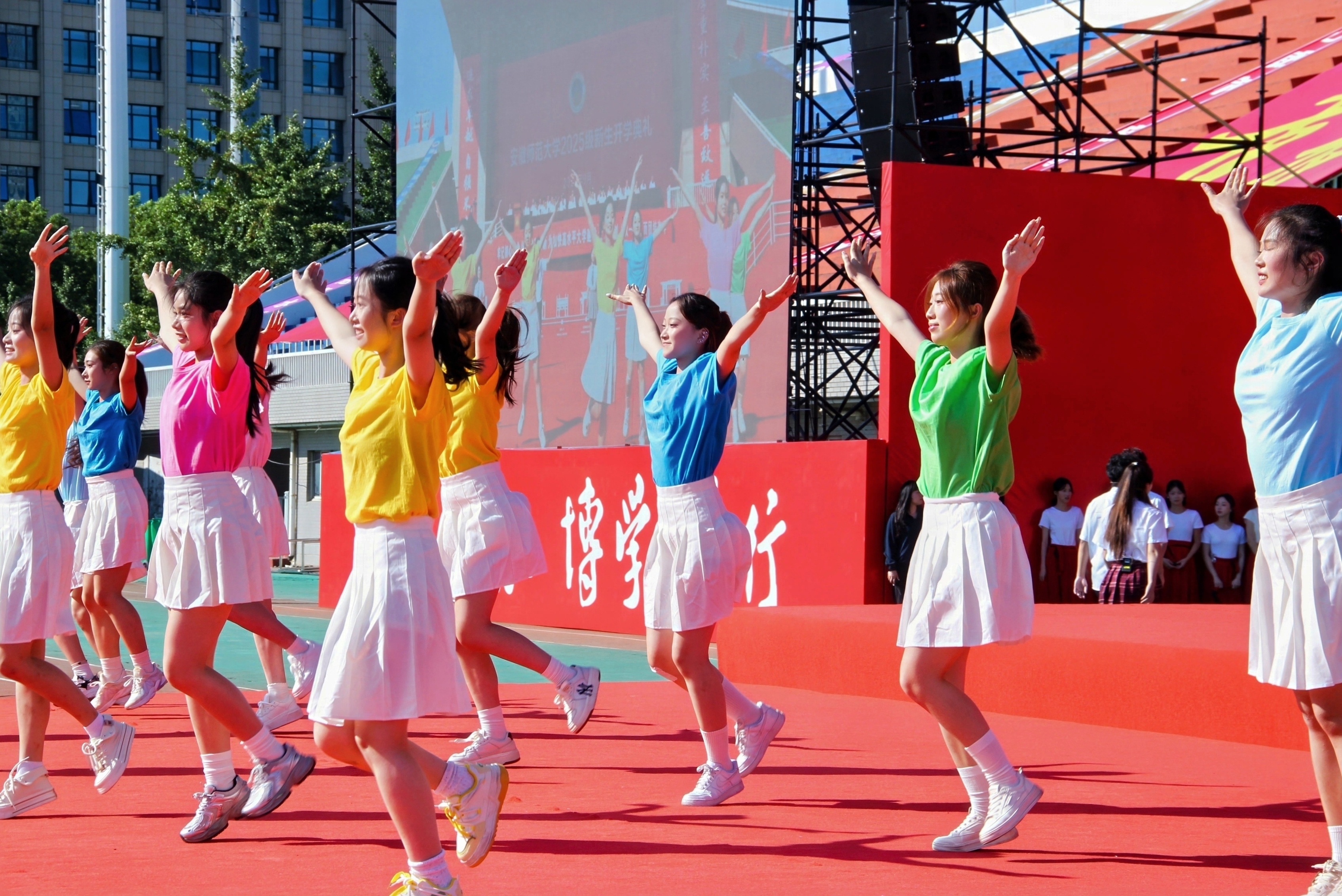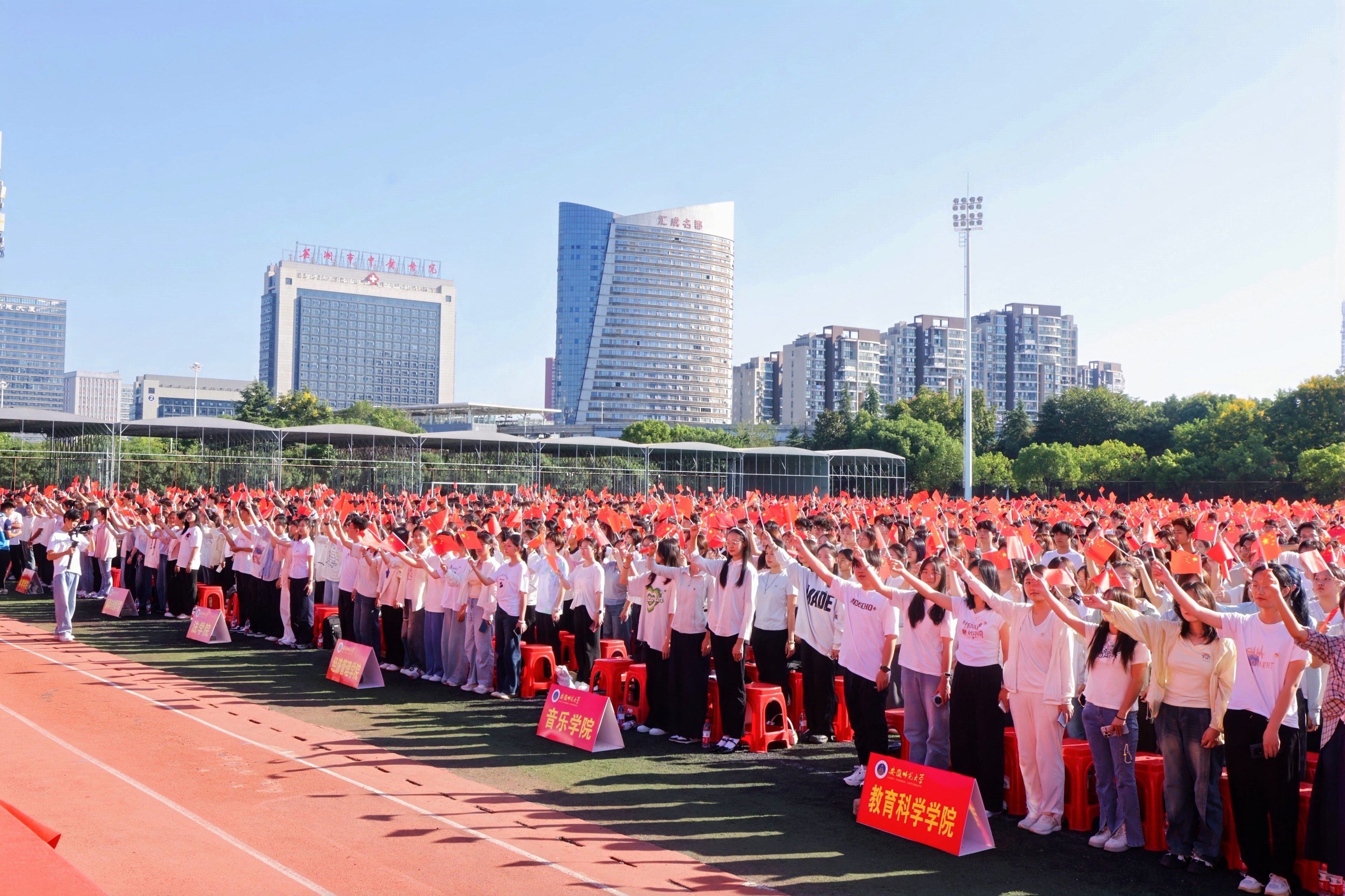 典礼开始前,暖场节目《青春思政课·广场音诗画:青春万岁!祖国万岁!》精彩纷呈,以“青春·信仰·家国”为主题串联起一道道视听盛宴。校大学生艺术团的同学们朗诵的《青春万岁·序诗》勾勒出青春的多彩与憧憬,《谁是最可爱的人》和《可爱的中国》节选朗诵,以深沉的情感和磅礴的气势,引领学子感悟家国情怀与时代责任;歌曲《飞》以激昂旋律唱出师大学子勇往直前的豪情;《青年友谊圆舞曲》轻快活泼,展现出青年一代的团结与友爱;歌曲《如愿》深情款款,传递出对先辈奋斗的感恩与对盛世中华的祝福。在《我爱你,中国》的恢弘合唱中,巨幅国旗与校旗方阵自北向南缓缓穿行于方阵,如河流奔涌向前,将现场渲染成一片浩荡的赤子“海洋”。
