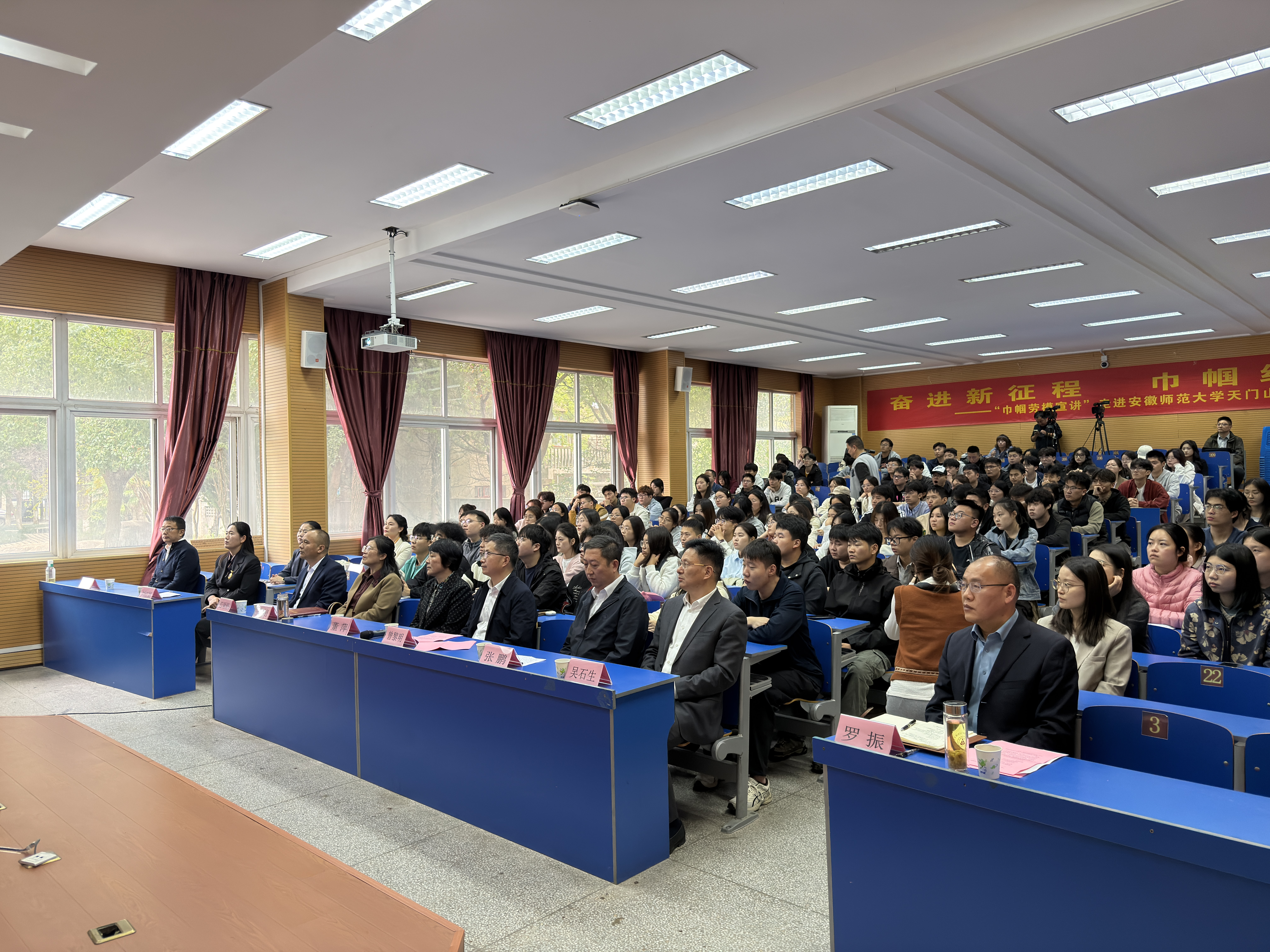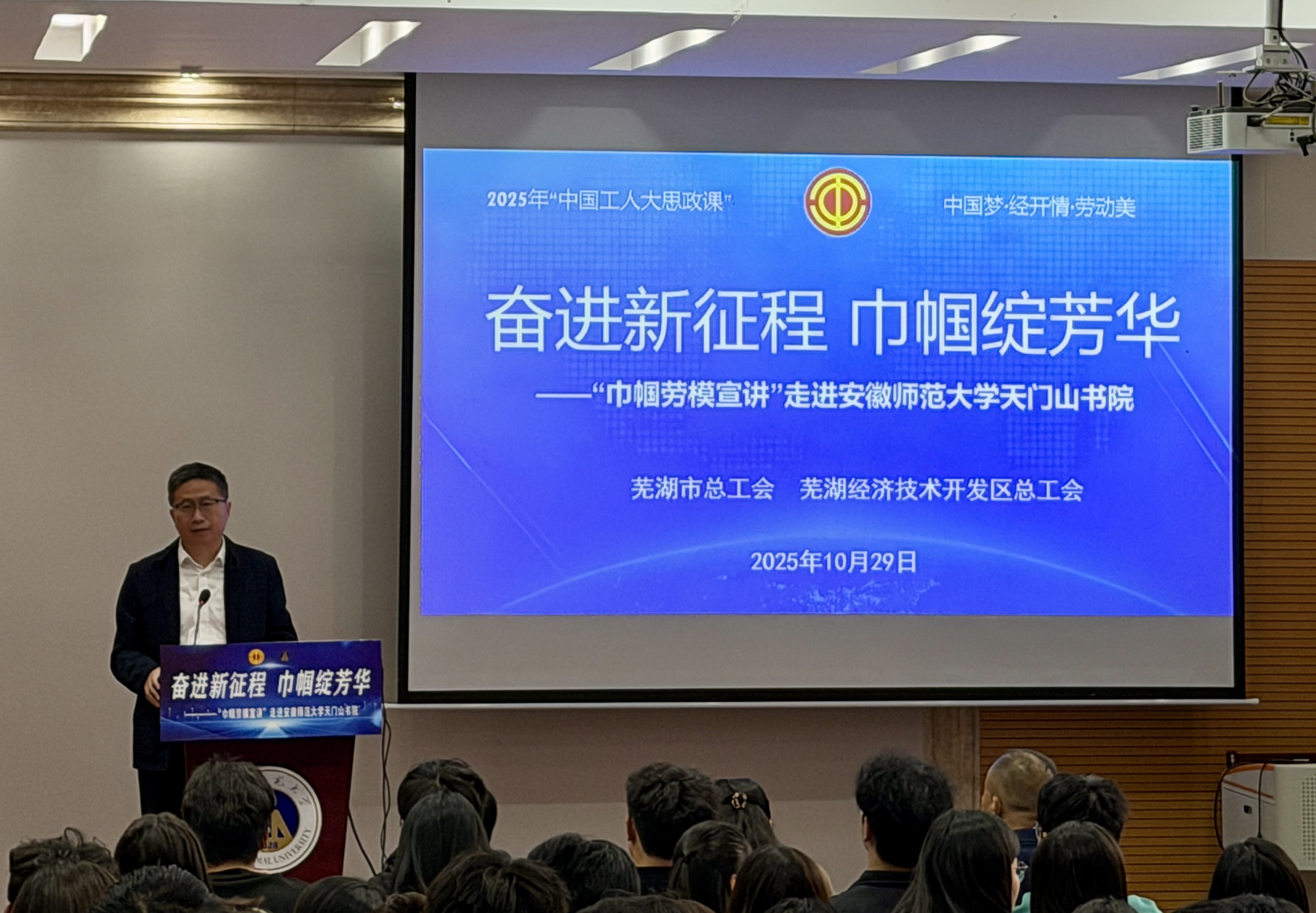 为深入学习贯彻习近平总书记关于劳模精神、劳动精神、工匠精神的重要论述,引导青年学子树立正确职业价值观,10月29日下午,由芜湖市总工会与经开区总工会共同主办的“中国工人大思政课”——“巾帼劳模工匠宣讲”活动在安徽师范大学天门山校区图书馆报告厅举行。校党委副书记曾黎明主持会议并讲话。