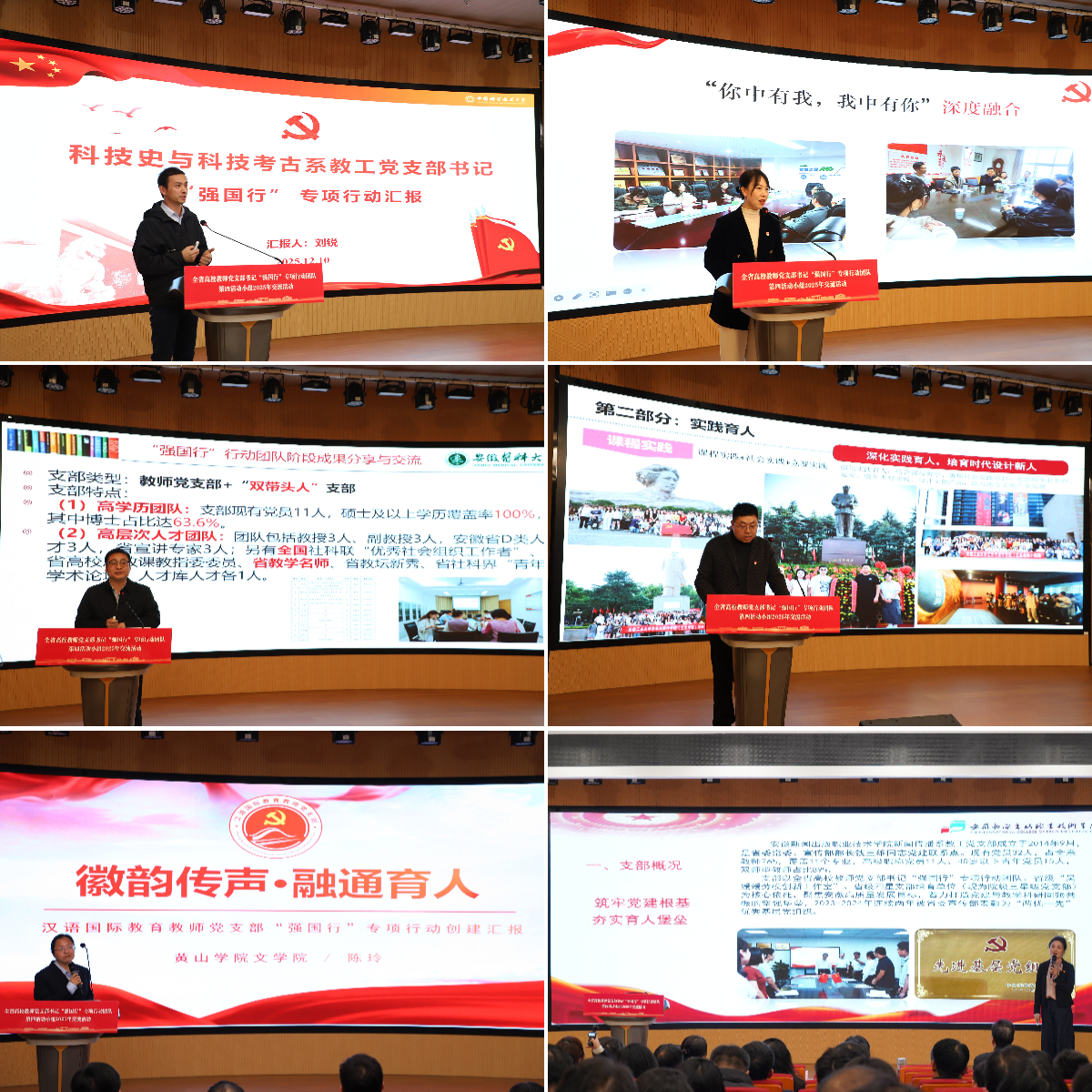 交流环节,中国科学技术大学、安徽师范大学、安徽医科大学、安徽工业大学、黄山学院、安徽新闻出版职业技术学院6所高校的教师党支部书记代表,围绕哲学社会科学领域党建与业务深度融合、思政教育创新实践、育人模式优化升级等主题,分享了各自的典型经验与特色做法,引发参加活动人员的广泛共鸣。