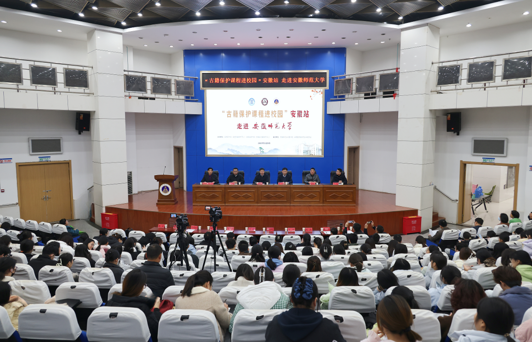 为深入贯彻落实中共中央办公厅、国务院办公厅印发《关于推进新时代古籍工作的意见》精神。12月9日上午,由国家图书馆(国家古籍保护中心)、安徽省图书馆(安徽省古籍保护中心)联合主办,安徽师范大学图书馆与团委共同承办的“古籍保护课程进校园”活动在我校花津校区敬文图书馆举行。校党委常委、副校长王刚,安徽省古籍保护中心主任、安徽省图书馆党总支书记、馆长左金刚,以及来自芜湖市图书馆、安徽中医药大学图书馆等单位的领导专家与300余名师生代表参加了活动。活动仪式由校图书馆党总支书记姜长付主持。