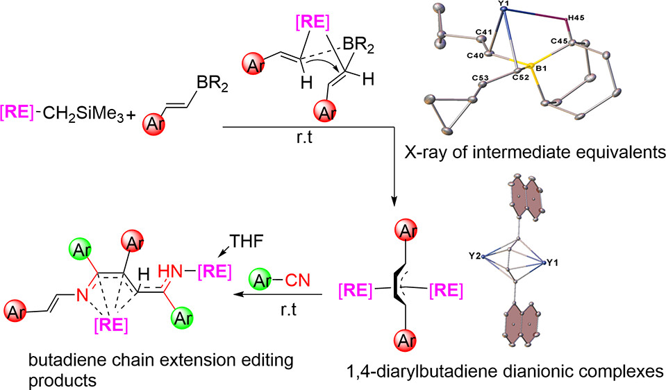 化学与材料科学学院博士研究生郭殿军作为第一作者,以“Strategy for the Synthesis of Inverse Sandwich 1,4-Diarylbutadiene Dianionic Rare-Earth Metal Complexes via Directing Coupling of b-Aryl Vinyl Boron Reagents”为题,于近日在国际化学顶级期刊《Journal of the American Chemical Society》上发表研究论文。研究认为,稀土金属有机化学研究团队利用稀土金属单烃基配合物引发亲核β-芳基乙烯基硼试剂发生直接偶联反应,成功构建出一系列具有反夹心结构的1,4-二芳基-1,3-丁二烯双阴离子(DABDA)稀土金属配合物。该反应展现出优异的官能团兼容性,多种取代苯基以及萘基、芘基等大位阻基团均能适用于该反应。当采用β-噻吩基乙烯基硼试剂时,发现碳-碳偶联及BBN基团对C-S键的迁移插入,生成丁二烯取代噻吩环扩张硼杂噻吩稀土金属配合物。该研究从“亲核烯基硼直接偶联构建丁二烯双阴离子”这一核心突破出发,既提供稀土促进1,2-金属迁移的关键实验证据,又揭示DABDA单元在还原化学与线性共轭分子在骨架编辑中的潜力。原文链接https://pubs.acs.org/doi/10.1021/jacs.5c19265。论文的通讯作者为朱先翠教授(安徽师范大学),王绍武教授(安徽工程大学)和朱军教授(香港中文大学-深圳)。