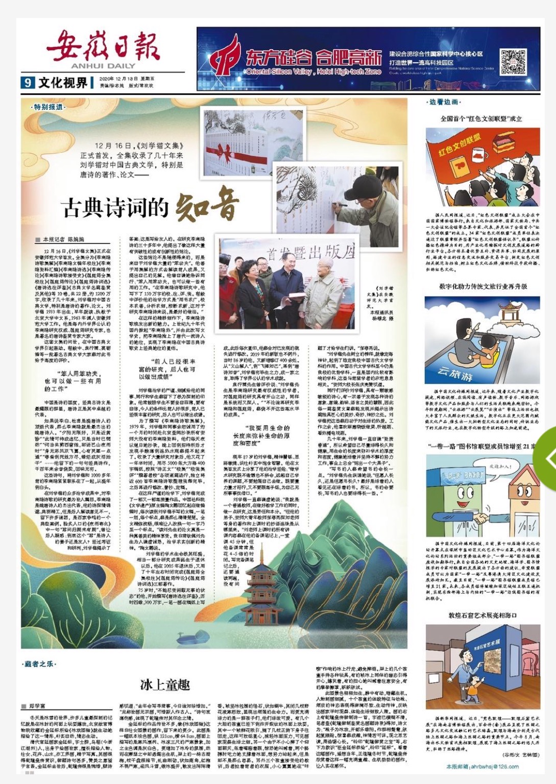 12月18日,《安徽日报》第9版“文化视界”头条以“古典诗词的知音”为题报道我校刘学锴教授。文中引用刘学锴先生在《刘学锴文集》首发暨出版座谈会上的经典语录,从“笨人用笨功夫,也可以做一些有用的工作”“前人已经很丰富的研究,后人也可以做出成绩”“我要用生命的长度来弥补生命的厚度和密度”三个方面,全面深度报道了刘学锴先生的为文、为学、为人、为师之道,并将其赞誉为“古典诗词的知音”。