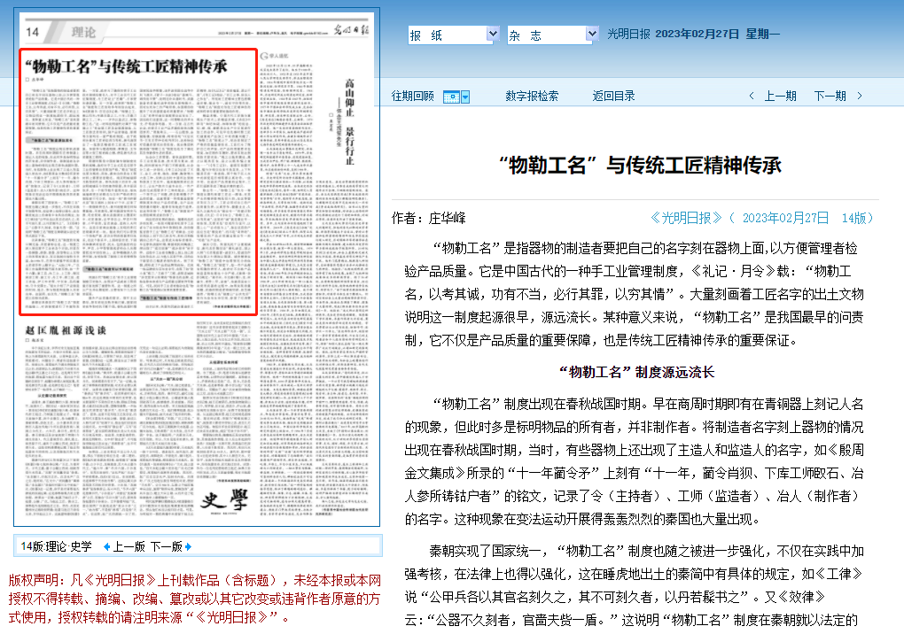 2月27日,《光明日报》第14版“理论·史学”版面头条刊发了我校历史学院庄华峰教授题为《“物勒工名”与传统工匠精神传承》的理论文章。文章从“‘物勒工名’制度源远流长”“‘物勒工名’制度何以长期延续”“‘物勒工名’制度与传统工匠精神”三个方面全面阐述了“物勒工名”制度的意义,它是我国最早的问责制,不仅是产品质量的重要保障,也是传统工匠精神传承的重要保证,对传统工匠精神的形成和传承有着重要的推动作用。