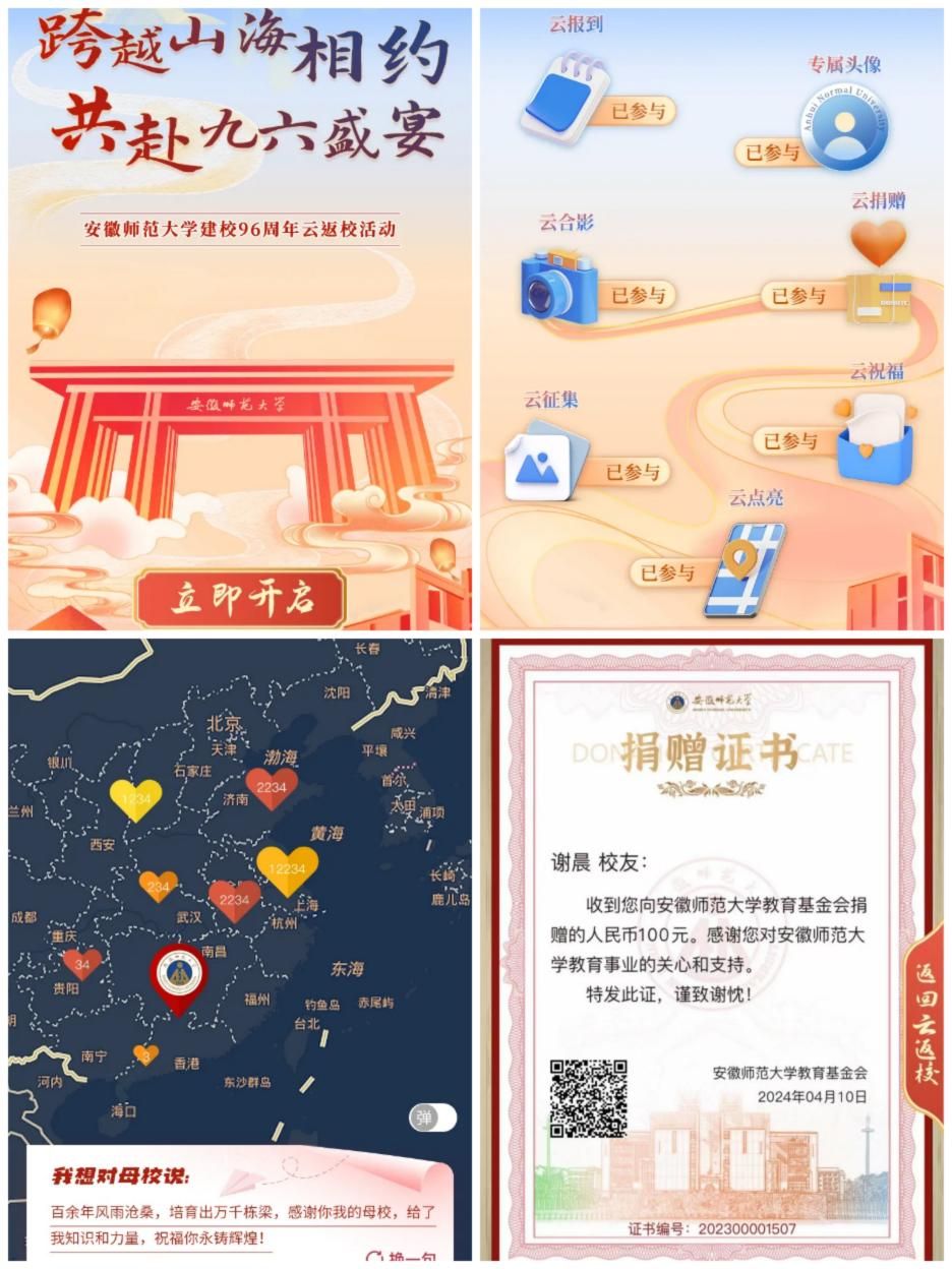 4月10日,“跨越山海相约,共赴九六盛宴”云返校活动在校友综合管理服务线上平台与校友准时相约,校友办热忱邀请全体师生、海内外校友及所有关注并支持学校发展的朋友们齐聚云端,共同为安徽师大96周年华诞发送祝福。云端活动共设计了包括“云报到”“专属头像”“云合影”“云祝福”“云征集”“云点亮”和“云捐赠”等在内的七大模块线上活动,让校友们能以更加生动的形式向母校表达爱意与祝福。校庆当日共有2471人次参加云校庆活动。