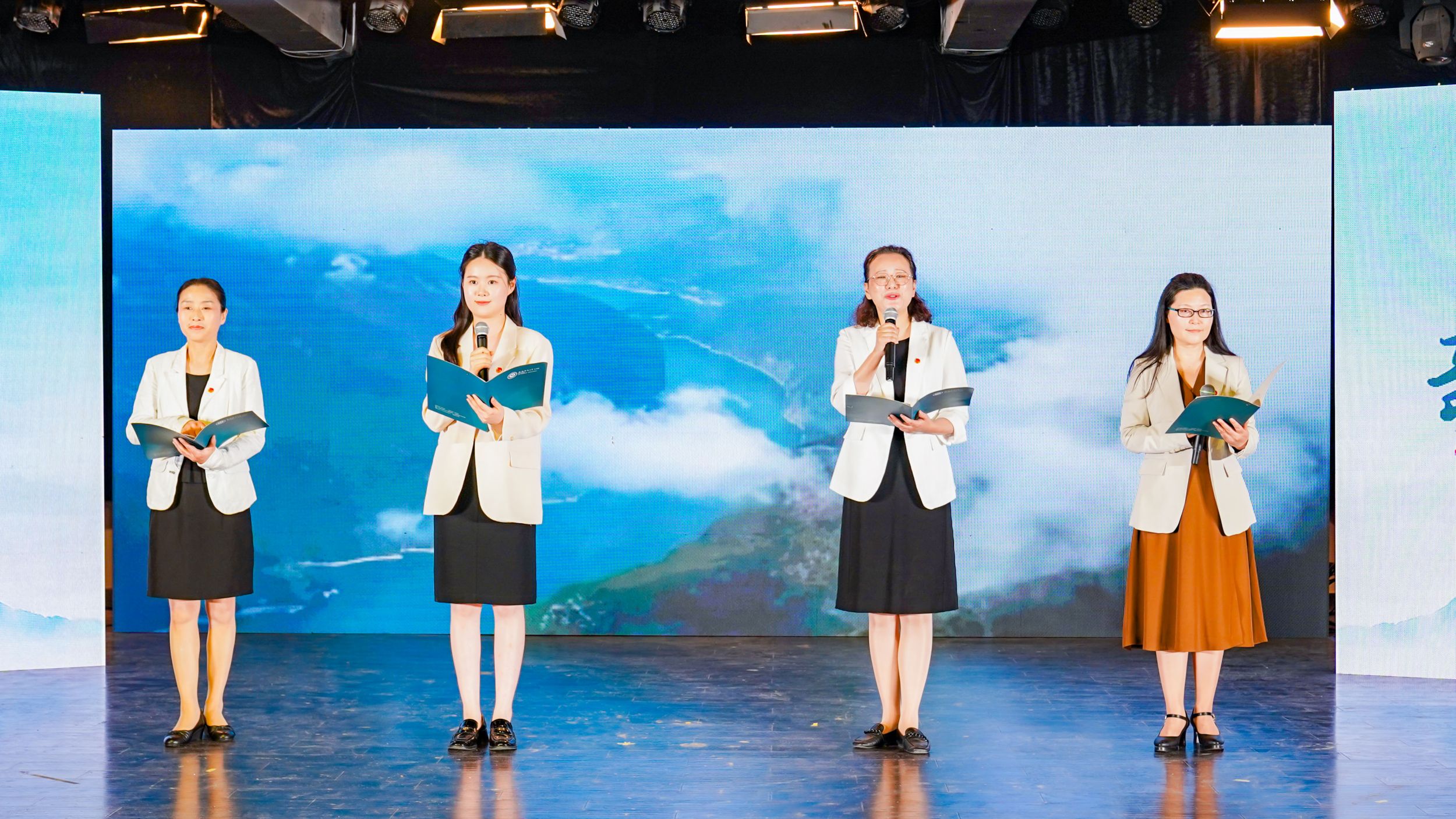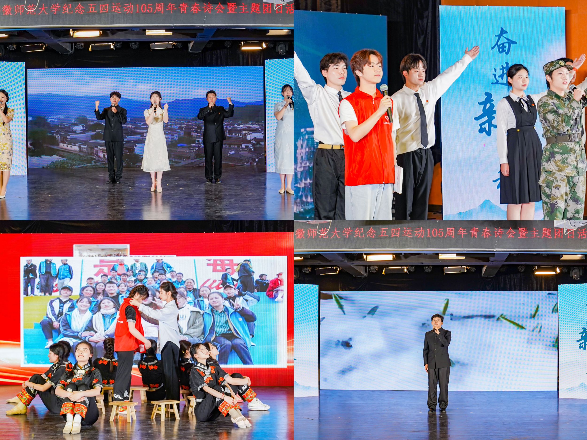 活动以“诗诵青春志 奋进新征程”为主题,分为“追忆·初心如磐”“青春·奋楫笃行”“礼赞·征程如虹”三个篇章,采用音诗画、情景剧、舞蹈、合唱等多种形式,带领师生沉浸式体验家国情怀与青春力量。《对话·红色追忆》《沂蒙花开》《小草在歌唱》等红色诗文,用饱满的情意致敬英雄儿女。原创情景朗诵《书写青春华章》《吾皖梦乡》和舞蹈《您的模样》、合唱《有我》展示了新时代青年的风华征程。《祖国啊,我亲爱的祖国》青春的誓言字字铿锵。文学院教师汪红艳、芮瑞、刘颖、杨玉婷朗诵的诗歌《读中国》将整场气氛推向高潮。活动尾声,全体人员重温了入团誓词。文学院青年教师魏文文博士在交流发言中解读了五四诗歌的历史与特点,她表示,青春是一首诗,饱含着对自由的追求,展现了积极进取的精神,鼓励同学们高举理想旗帜,仰望星空,乘风破浪,勇做新时代弄潮儿。