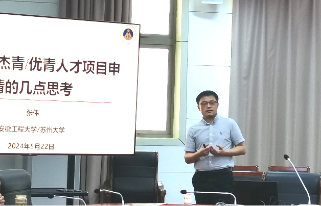 5月22日下午,我校在花津校区会议中心第一会议厅召开2024年安徽省自然科学基金杰青、优青项目申报辅导报告会。校党委常委、副校长高峰参加会议并讲话,安徽工程大学教授张伟、安徽师范大学教授商永嘉、刘小明应邀作专题辅导报告。学校理工科学院科研副院长及拟申报老师参加报告会,科研处副处长许新胜主持会议。