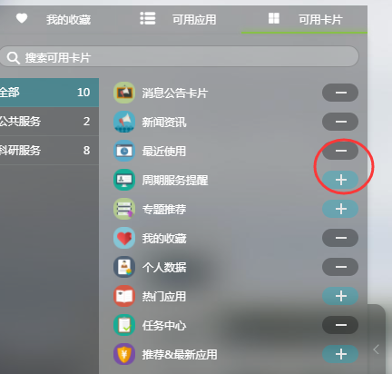 通过点击侧边栏的“可用卡片”,弹出卡片设置对话框,通过点击卡片右侧的“+”按钮可以将该卡片显示在个人首页,通过点击“-”按钮可以取消在个人首页显示该卡片。