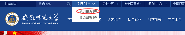 在安徽师范大学官网上方点击“信息门户”->“新版信息门户”或者在浏览器地址栏输入http://ehall.ahnu.edu.cn, 点击“登录 Login”按钮,用户名和密码不变。