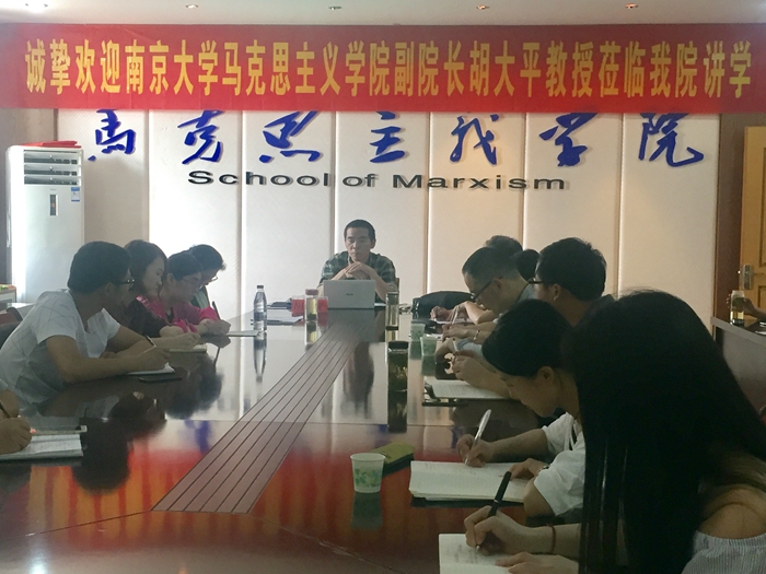 5月21日下午,南京大学马克思主义学院副院长、博士生导师胡大平教授应邀为马克思主义学院师生作了一场题为“理论敏感性和研究想象力——马克思主义哲学研究感悟”的学术讲座。讲座由副院长汪盛玉教授主持,学院干成俊教授、吴兴华教授以及部分青年教师和研究生到场聆听了讲座。