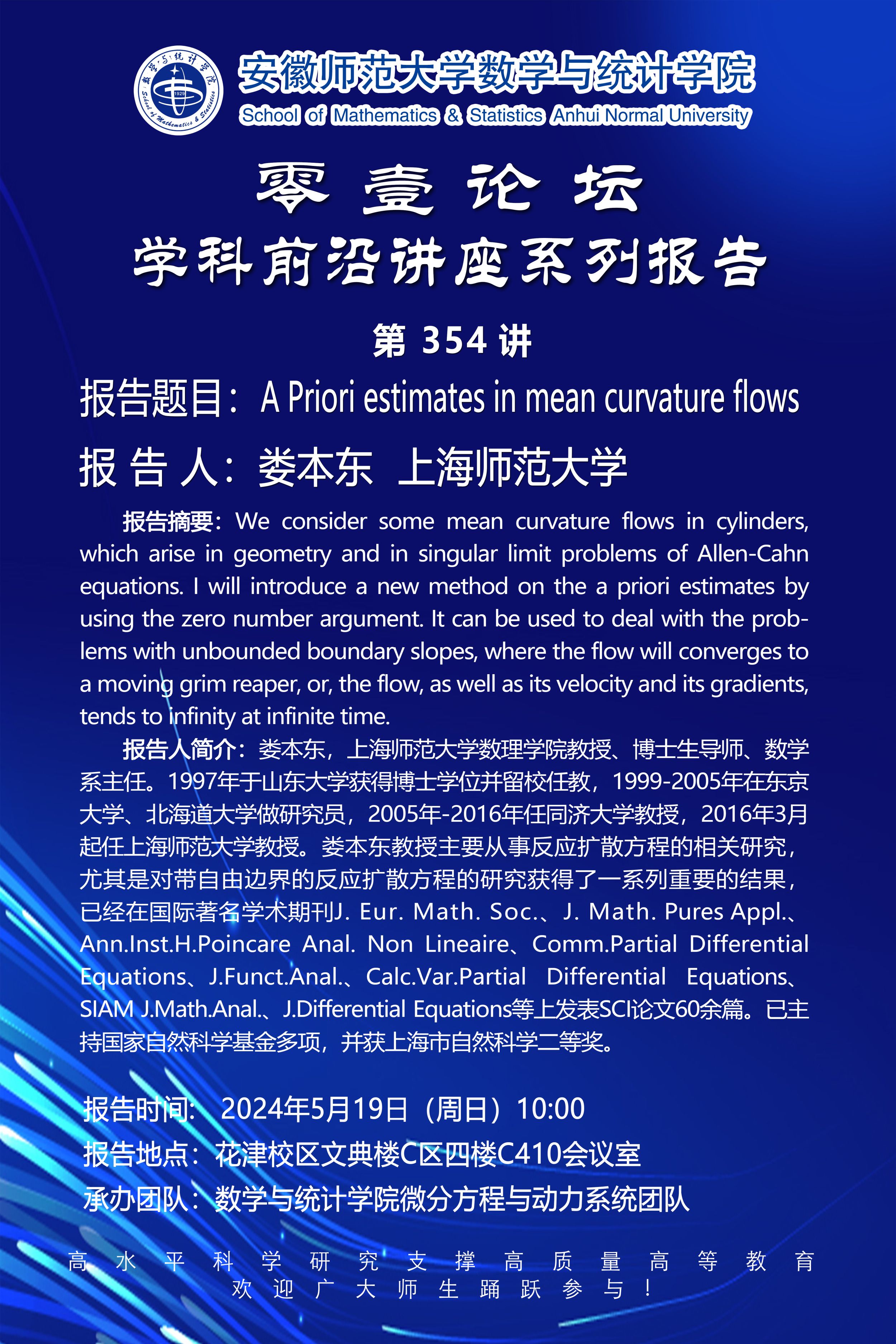 【学术预告】数学与统计学院零壹论坛第354讲:A Priori estimates in mean curvature flows
