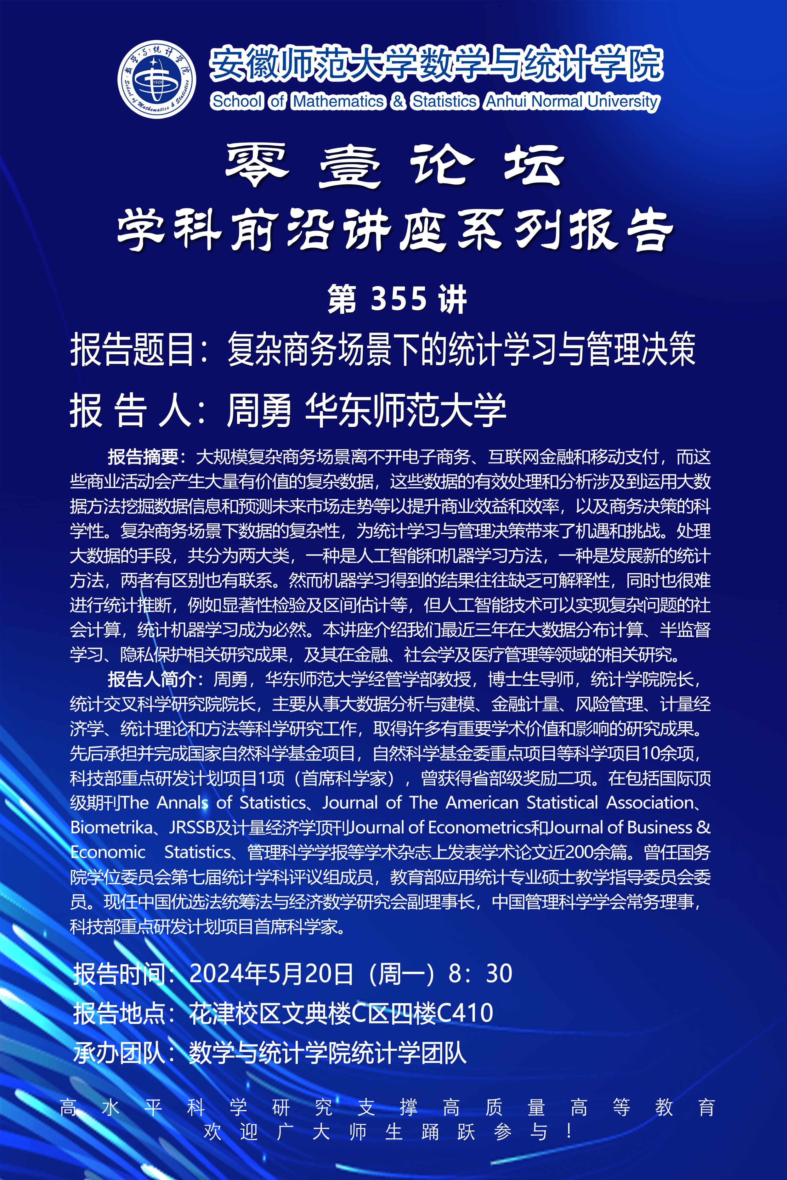【学术预告】数学与统计学院零壹论坛第355讲:复杂商务场景下的统计学习与管理决策