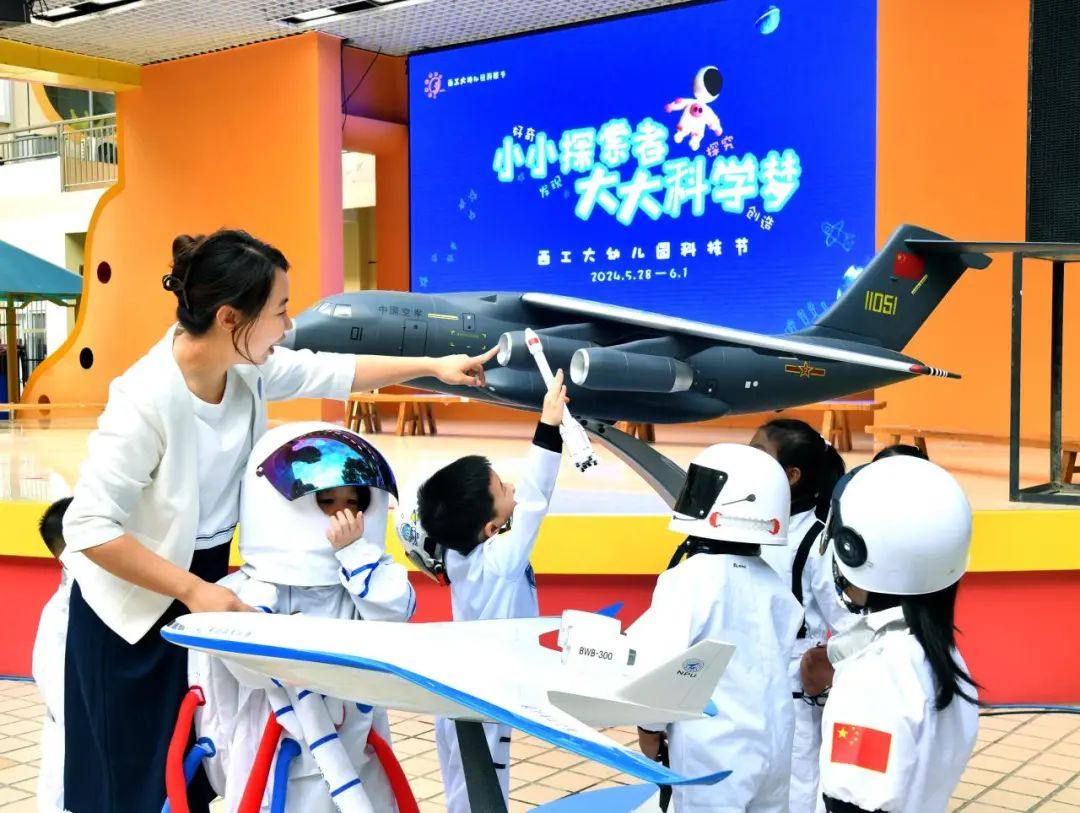 西北工业大学幼儿园的孩子们参与科技节活动,了解“运-20”飞机。