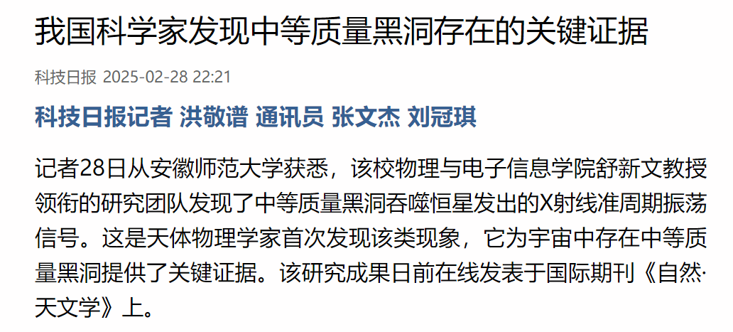 记者28日从安徽师范大学获悉,该校物理与电子信息学院舒新文教授领衔的研究团队发现了中等质量黑洞吞噬恒星发出的X射线准周期振荡信号。这是天体物理学家首次发现该类现象,它为宇宙中存在中等质量黑洞提供了关键证据。该研究成果日前在线发表于国际期刊《自然·天文学》上。