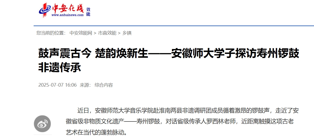 近日,安徽师范大学音乐学院赴淮南两县非遗调研团成员循着激昂的锣鼓声,走近了安徽省级非物质文化遗产——寿州锣鼓,对话省级传承人罗西林老师,近距离触摸这项古老艺术在当代的蓬勃脉动。