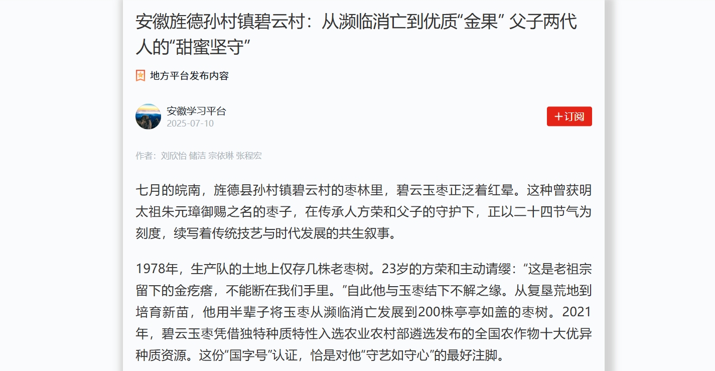 七月的皖南,旌德县孙村镇碧云村的枣林里,碧云玉枣正泛着红晕。这种曾获明太祖朱元璋御赐之名的枣子,在传承人方荣和父子的守护下,正以二十四节气为刻度,续写着传统技艺与时代发展的共生叙事。