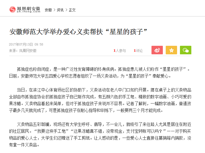 【凤凰网】安徽师范大学举办爱心义卖帮扶“星星的孩子”