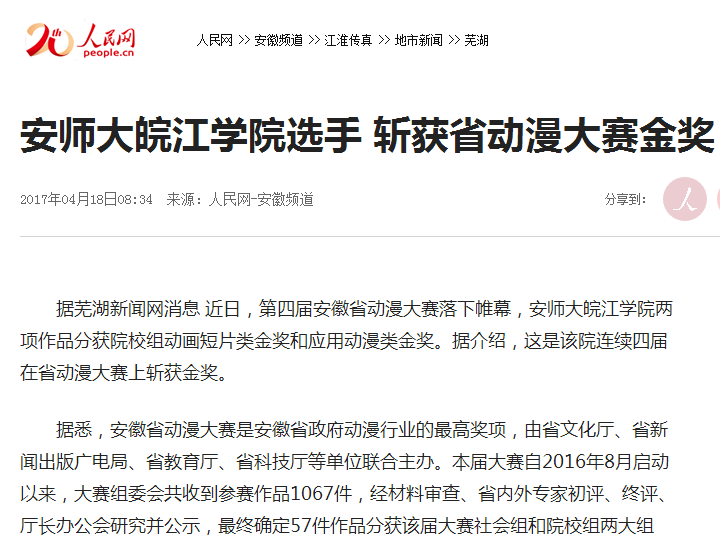 【人民网】安师大皖江学院选手 斩获省动漫大赛金奖