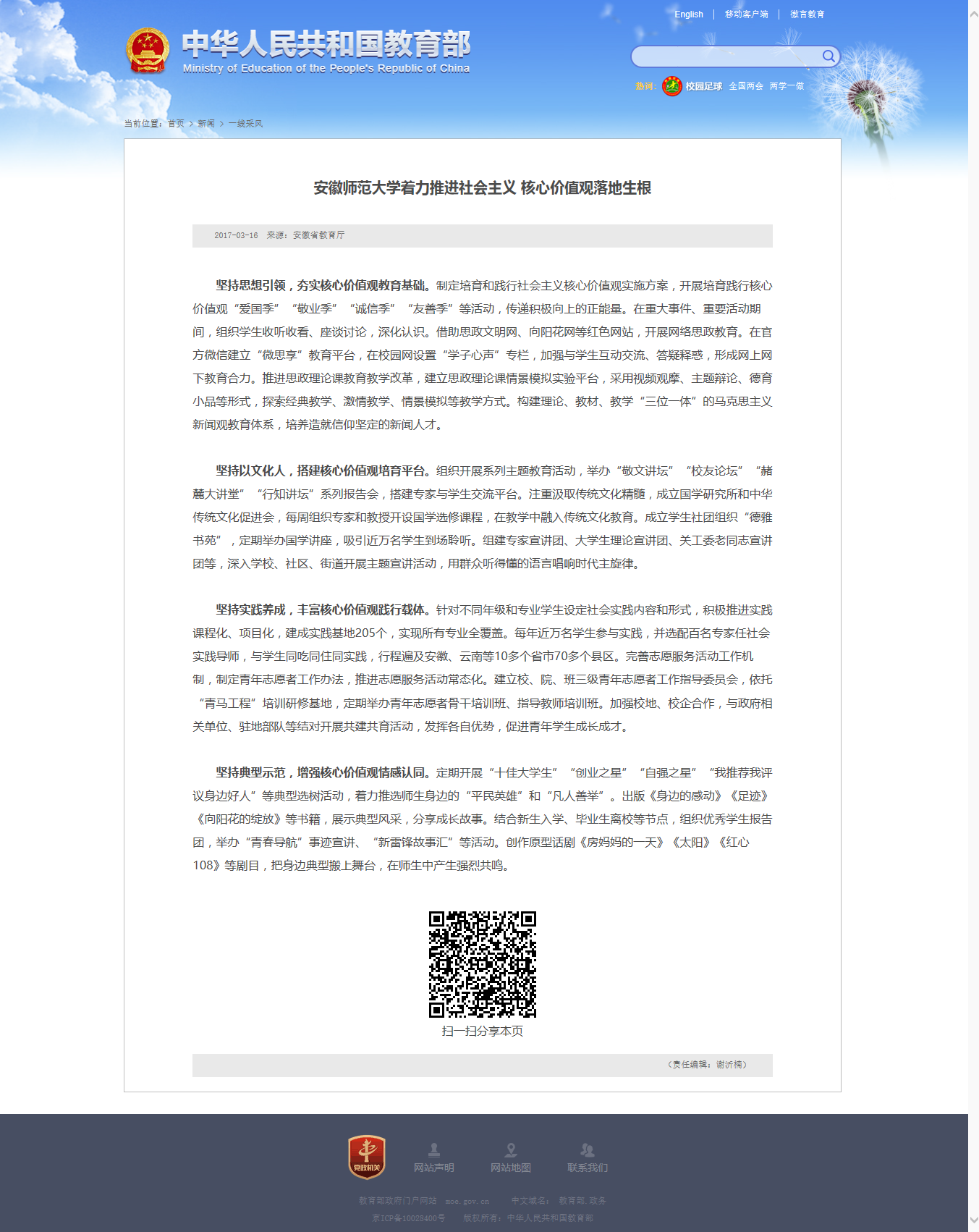 本网讯(党委宣传部)3月16日,教育部官网在一线采风栏目中以“安徽师范大学着力推进社会主义核心价值观落地生根”为题推介我校经验。