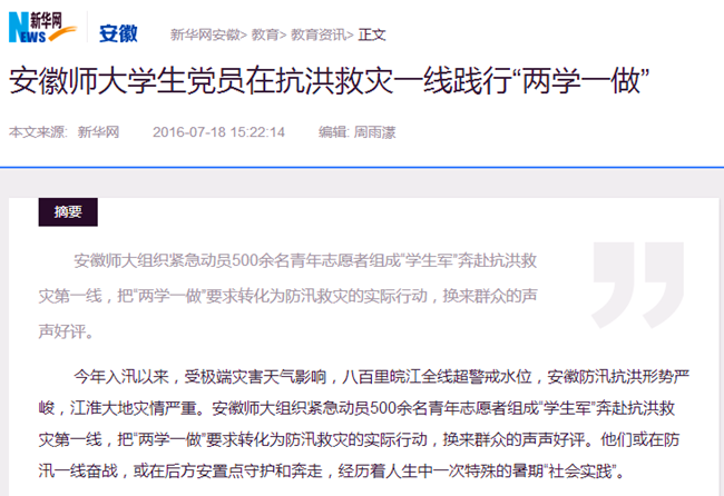 今年入汛以来,受极端灾害天气影响,八百里皖江全线超警戒水位,安徽防汛抗洪形势严峻,江淮大地灾情严重。安徽师大组织紧急动员500余名青年志愿者组成“学生军”奔赴抗洪救灾第一线,把“两学一做”要求转化为防汛救灾的实际行动,换来群众的声声好评。他们或在防汛一线奋战,或在后方安置点守护和奔走,经历着人生中一次特殊的暑期“社会实践”。