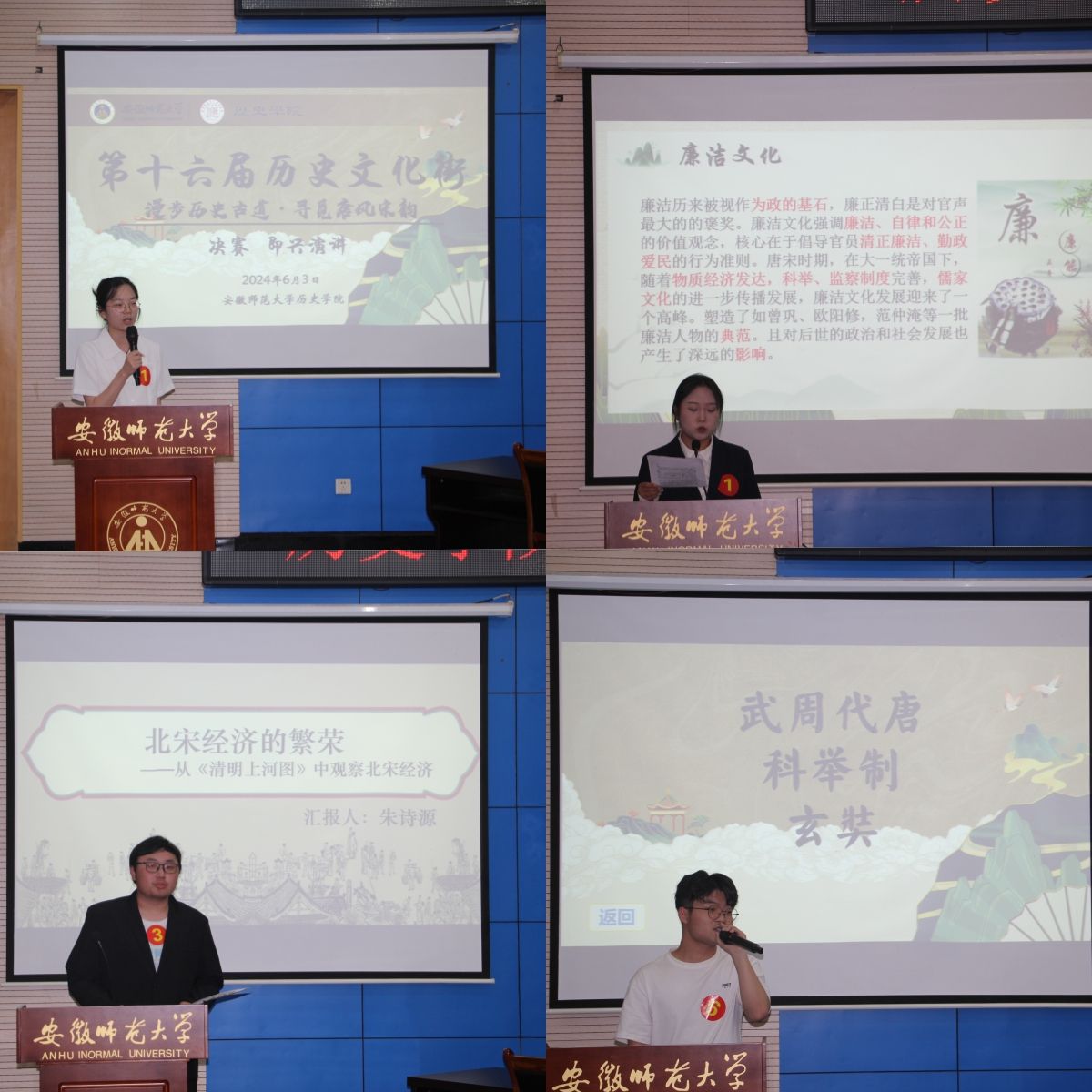 6月3日晚,决赛在圆形报告厅第三报告厅举行,特邀学院党委副书记宫超、历史学专业主任王月、专业教师刘亚光、团委书记朱晓华、研究生邓高翔和尚志琴作为决赛评委出席。决赛共有现场答题与主题演讲两大环节,现场答题又分为抽答、快速抢答和即兴演讲三个小环节。参赛队伍展现出扎实的基本功和临场应变能力,博得全场掌声。宫超在即兴演讲点评中肯定了各队伍的精彩表现,提醒同学们即兴演讲既要围绕主题,也要以古鉴今,做到古今结合。王月在总结中对本届活动的主题选择、同学们的历史素养和学习热情都给予了肯定,她鼓励同学们要秉持初心,在学史明智的过程中继往开来,为传承发展中华优秀传统文化做贡献。