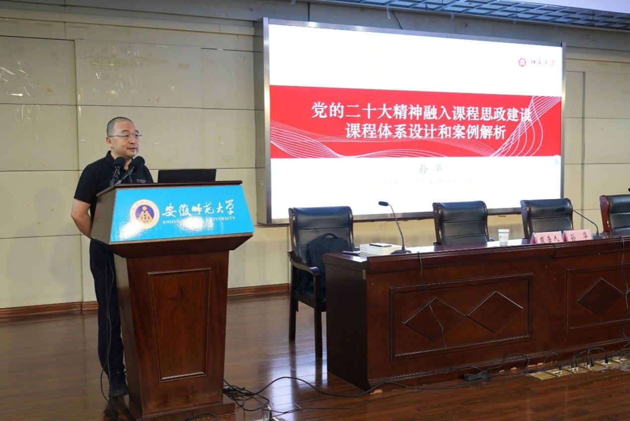 培训会上,北京大学孙华教授以《课程思政教学实践与精彩案例分享》为题,通过解读教育部相关政策、学校和院系的实施方案,探讨了如何在课程思政中发挥教和学的两个主体作用。他提出要在专业教学中总结、提升和凝练课程思政的经验,分类推进课程思政建设要在教学设计中通过学生的参与让课程思政入脑、入心。他还结合自己在北大的教学经验,分享了北京大学教学档案袋平台中的课程思政示范课程和示范专业建设培育,以及北京大学多门案例课程如何在专业课程中融入课程思政,为我们推进课程思政建设提供了宝贵经验。