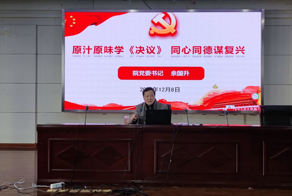 会上向全体教职工发放了《<决议>学习材料汇编》。会后,学院还组织各支部召开座谈会,围绕“《决议》精神学习体会”“如何培养‘三有’外语人才”等议题开展专题学习研讨。