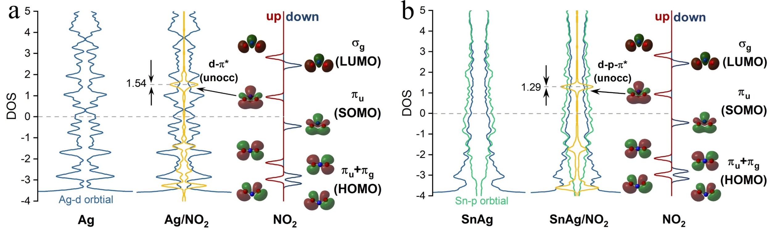图1. (a) Ag (b) SnAg的四维轨道、NO2分子和表面吸附NO2的PDOS。