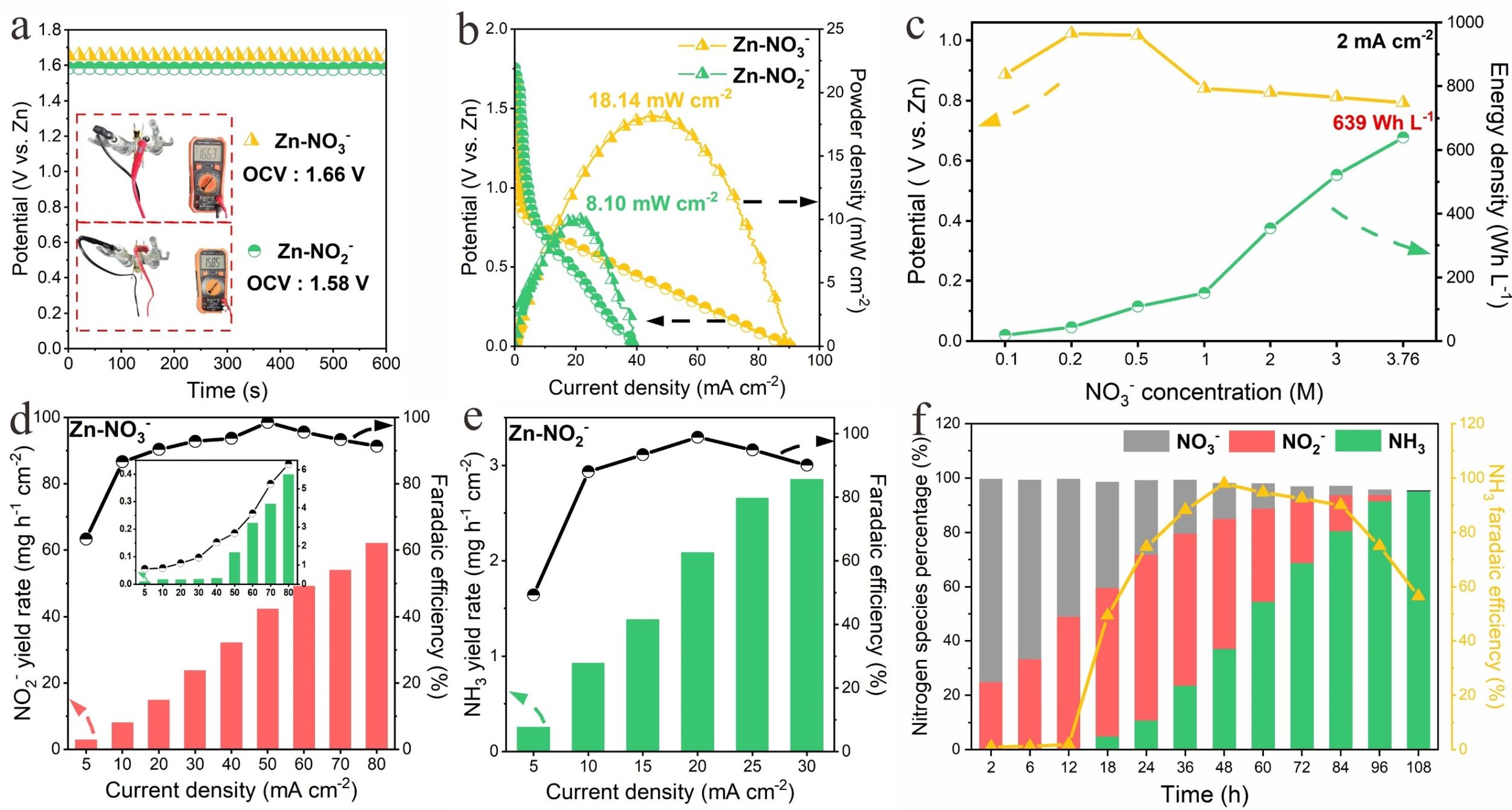 图3.用SnAg和Zn箔研究了组合Zn-NO3-和Zn-NO2-水溶液电池的电化学性能。