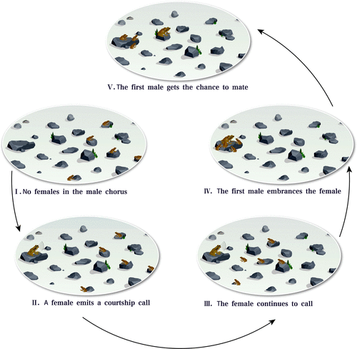 吴海龙教授研究组通过多年的野外调查和近自然条件下的行为试验发现,与其它蛙蟾类不同,凹耳蛙雌蛙不是根据自身的交配偏好选择所青睐的雄蛙,而表现出一种新的、独特的性选择模式(图2),即雌蛙不接近雄蛙,而在距离雄蛙合唱群一定距离的地方发出求偶鸣声,吸引并煽动附近雄蛙间的竞争;这种竞争不是直接的身体对抗,而表现为对雌蛙叫声的响应速度和定位准确性;雌蛙最终与在竞争中获胜的雄性(最先找到并抱住雌蛙的雄蛙,也就是对雌蛙叫声响应速度更快、定位更准确的雄蛙)交配。采取这种策略,雌蛙既可以避免因主动选择配偶所要付出的时间和能量代价,同时,可以增加与高质量雄蛙交配的机会(获得交配机会的是在竞争中获胜的雄蛙)。从进化的角度来说,这种交配策略是保证雌蛙获得最大繁殖适合度最经济、最高效的途径;也是对在山溪激流环境中生存繁衍的一种进化适应。