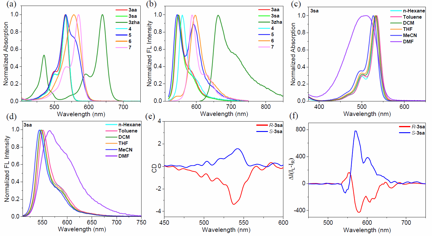 作者对得到的硼手性氟硼二吡咯类化合物光学性质进行探究发现,该类化合物具有优异的光学性质,例如优良的荧光量子产率、显著的圆二色光谱和圆偏振荧光光谱活性等。该类化合物展现了作为一类新颖的手性有机染料的潜在应用价值。