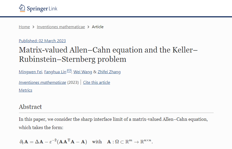 近日,我校数学与统计学院副院长费明稳教授与美国纽约大学柯朗研究所林芳华教授、浙江大学王伟教授、北京大学章志飞教授合作的学术论文“Matrix-valued Allen–Cahn equationand theKeller–Rubinstein–Sternberg problem”在国际数学领域四大顶尖刊物之一《Inventiones Mathematicae》上在线发表。该项工作得到了国家自然科学基金项目(批准号:11871075、11971357)等的资助。