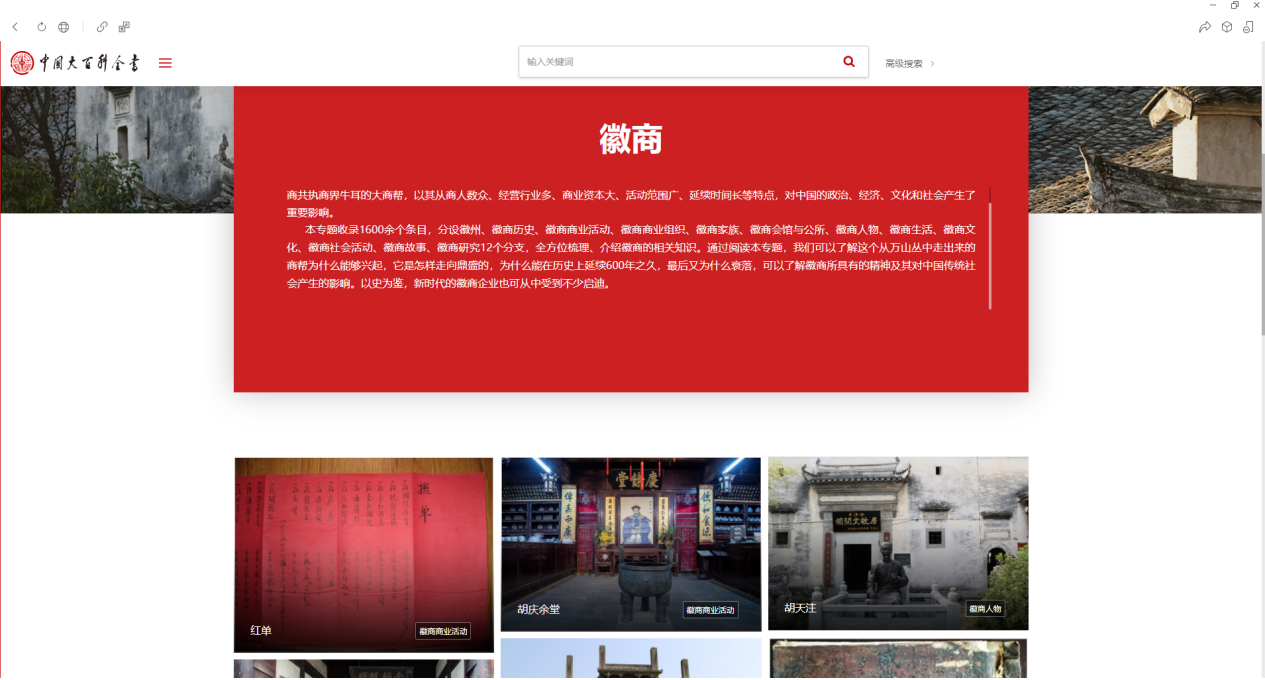 “徽商专题”网络版地址:https://www.zgbk.com/ecph/sublibrary?SiteID=1&ID=982