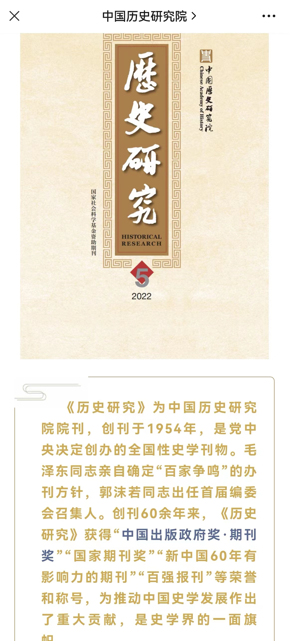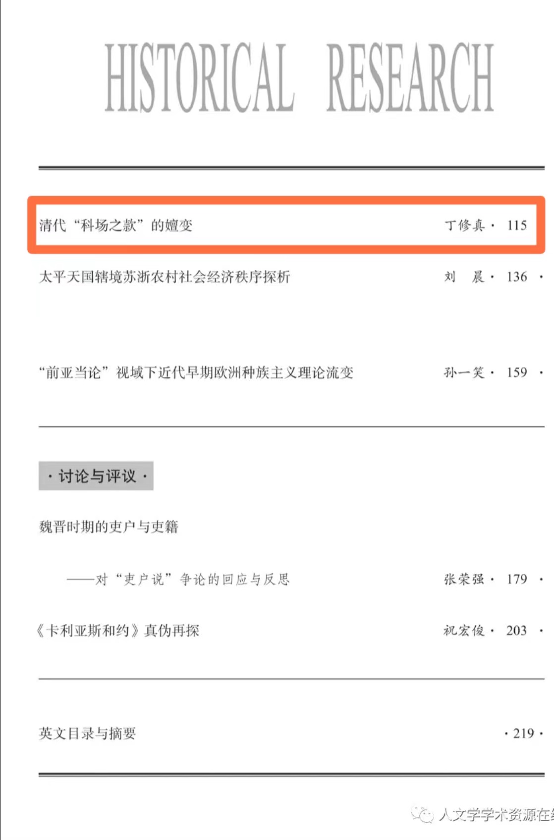 近日,历史学院丁修真教授的专题论文《清代“科场之款”的嬗变》于《历史研究》2022年第5期上发表。全文2.6万字,通过丰富的档案材料,对清代人才选拔制度的经济成本,进行了详细的论证。《历史研究》是由中国社会科学院、中国历史研究院主办的历史学领域顶级期刊,全年发文在70篇左右,明清史相关文章不超过10篇。该文的发表,证明我校历史学青年学者的学术水准,已获得国内同行的认可。