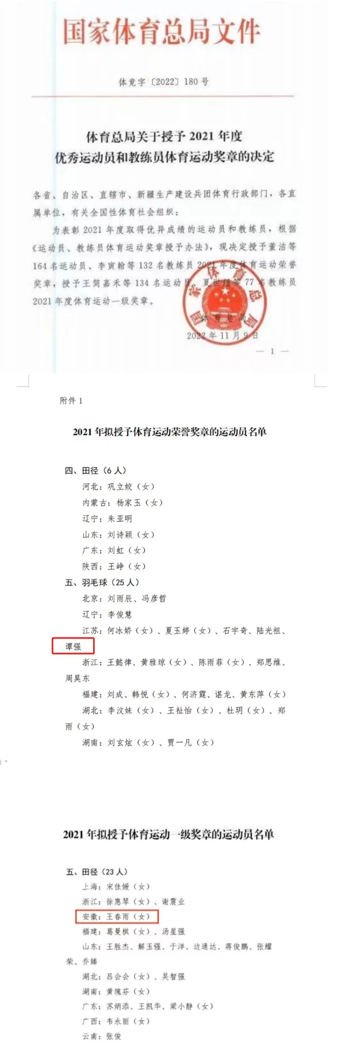 谭强在2021年苏迪曼杯世界羽毛球混合团体锦标赛中荣获冠军并夺得汤姆斯杯世界羽毛球男子团体锦标赛、西班牙世界羽毛球锦标赛男子双打亚军。王春雨在2021年东京奥运会女子800米决赛中跑出1分57秒00的个人生涯最好成绩获得第五名,取得了中国运动员参加奥运会女子800米项目比赛成绩的历史性突破。