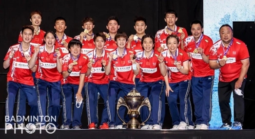 中国羽毛球队荣获2021年苏迪曼杯世界羽毛球混合团体赛冠军(后排右二为谭强)