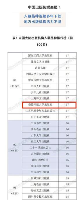 近日,《2022年中国图书海外馆藏影响力报告》由中国出版传媒商报独家发布。安徽师范大学出版社荣列“2022年中国图书海外馆藏影响力出版100强”,在安徽省大学出版社中排名第一。