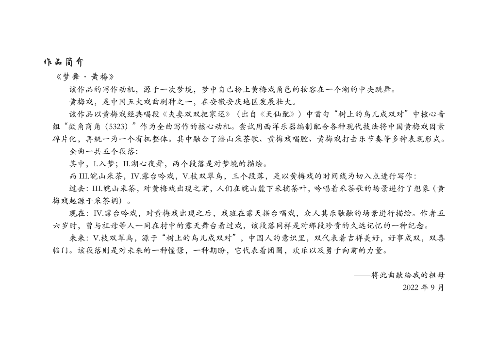 《梦舞·黄梅》采用比赛要求的完整编制,为6件不同乐器而作,意图将纯西方乐器与中国黄梅戏因素进行碰撞,交融。其中融合了潜山采茶歌、黄梅戏唱腔、黄梅戏打击乐节奏等表现形式,在弘扬本土传统文化的同时,也表达了作曲者内心最真诚的情感。对此,比赛评委贾国平教授提到:“优秀的作品会以不同的风格涌现出来,对于年轻作曲家来说,你们一定要坚持自己的信念以及自己的作曲理念,不要跟风,不要猜测,要发自内心地进行创作”。