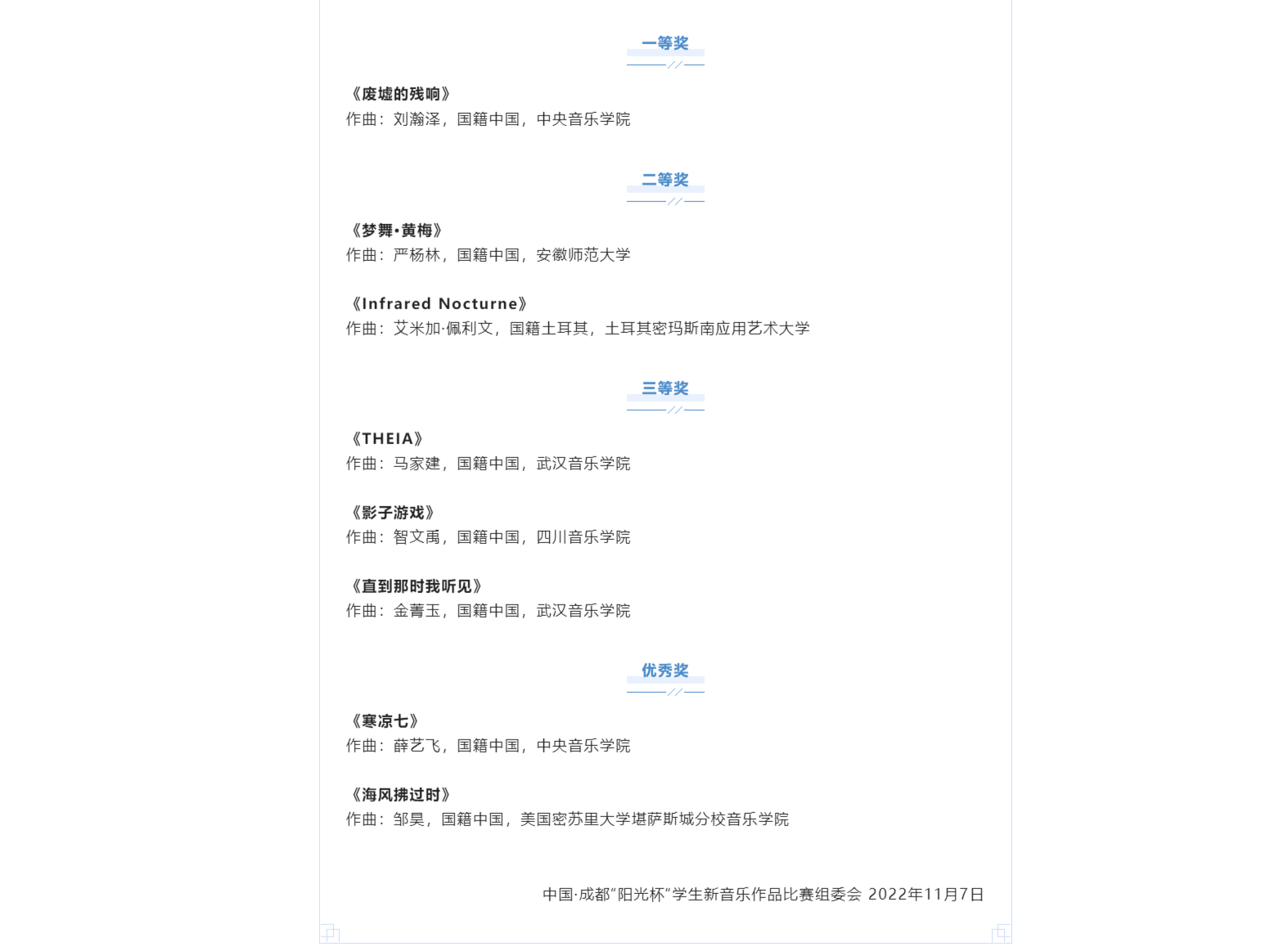 11月5日,第十八届(2022)中国·成都“阳光杯”学生新音乐作品比赛决赛音乐会(线上)在成都城市音乐厅举行。经7位国内外作曲专业评委评定,音乐学院2020级研究生严杨林(指导教师:王瑞奇)创作的作品《梦舞·黄梅》,与土耳其密玛斯南应用艺术大学艾米加·佩利文的作品《Infrared Nocturne》共同荣获二等奖。一等奖由全国艺术院校中唯一一所“211工程”重点建设大学、中央音乐学院学生刘瀚泽的作品《废墟的残响》夺得。武汉音乐学院马家建的《THEIA》、四川音乐学院智文禹的《影子游戏》、武汉音乐学院金菁玉的《直到那时我听见》获得三等奖。这是安徽师范大学学子首次在此项比赛中与国内外各所顶尖音乐院校角逐并崭露头角,取得了优异的成绩,实现了学校在此项赛事零的突破。据悉,这也是严杨林继2022第七届“汇创青春”上海大学生文化创意作品展示活动(音乐艺术类)器乐作品一等奖与歌曲三等奖之后的再次获奖。