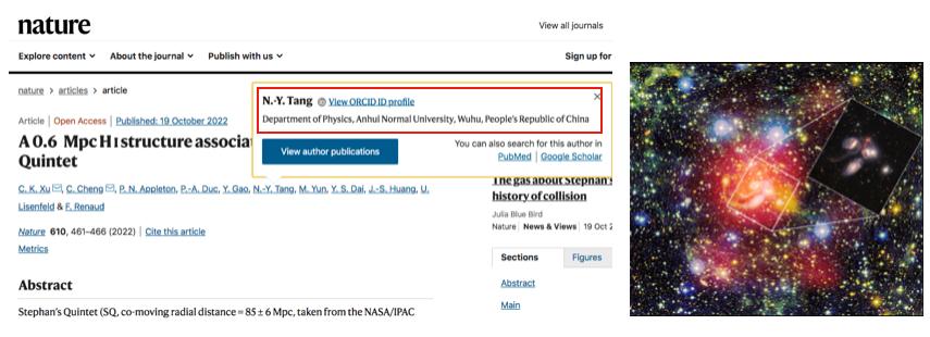 近日,我校物电学院青年教师汤宁宇博士参与的,由中国科学院国家天文台徐聪研究员带领的国际研究团队,利用中国天眼(FAST,五百米口径球面射电望远镜)对著名致密星系群“斯蒂芬五星系”及周围天区的氢原子气体进行了成像观测,发现了1个尺度大约为2百万光年的巨大原子气体系统,比我们所在的银河系大20倍,对于研究星系及其在宇宙中的演化提出了挑战。据了解,这是迄今为止在宇宙中探测到的最大的原子气体系统。该成果发表于国际顶尖学术期刊《自然》杂志,并被人民日报、新华社、中央电视台、科技日报等多家中央媒体报道。