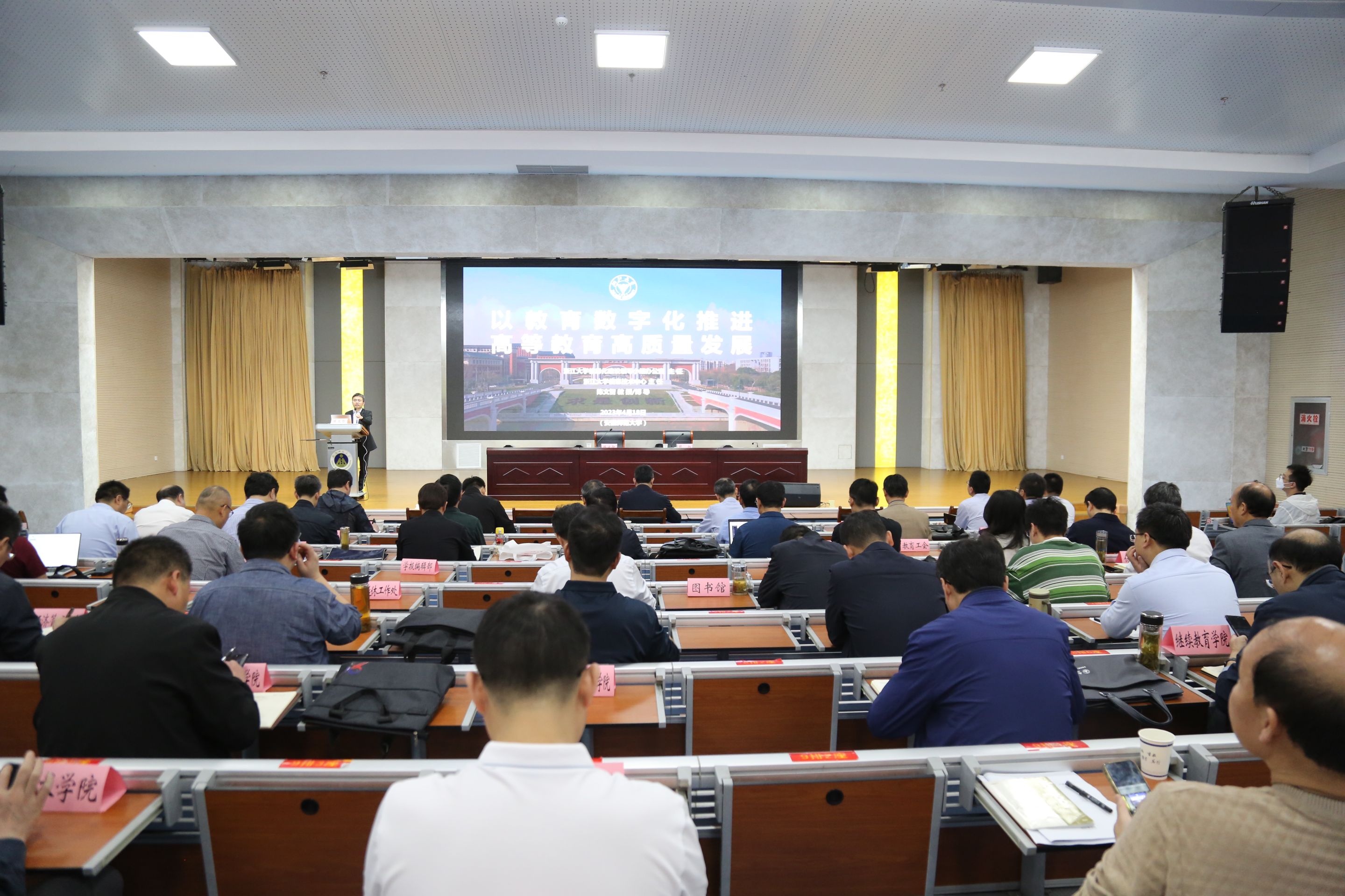 为提升领导干部信息化能力和履职能力,加快推进学校教育数字化转型,助力学校“两大振兴行动计划”,4月18日上午,学校在花津校区实训大楼报告厅举行领导干部信息化领导力专题培训会(第一期)。浙江大学信息技术中心主任、教育部教育管理信息化专家组副组长陈文智教授受邀作主题报告。校党委副书记周旭主持出席并主持培训会。校网络安全与信息化领导小组成员单位主要负责人、分管负责人,各学院教学副院长、教学秘书,各部门、各单位信息员参加培训。