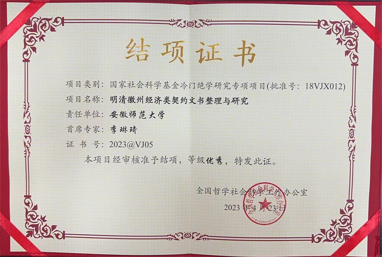近日,从全国哲学社会科学工作办公室获悉,我校历史学院李琳琦教授为首席专家的国家社科基金冷门绝学研究专项项目“明清徽州经济类契约文书整理与研究”(批准号:18VJX012)通过结项验收审批,批准鉴定等级为“优秀”。