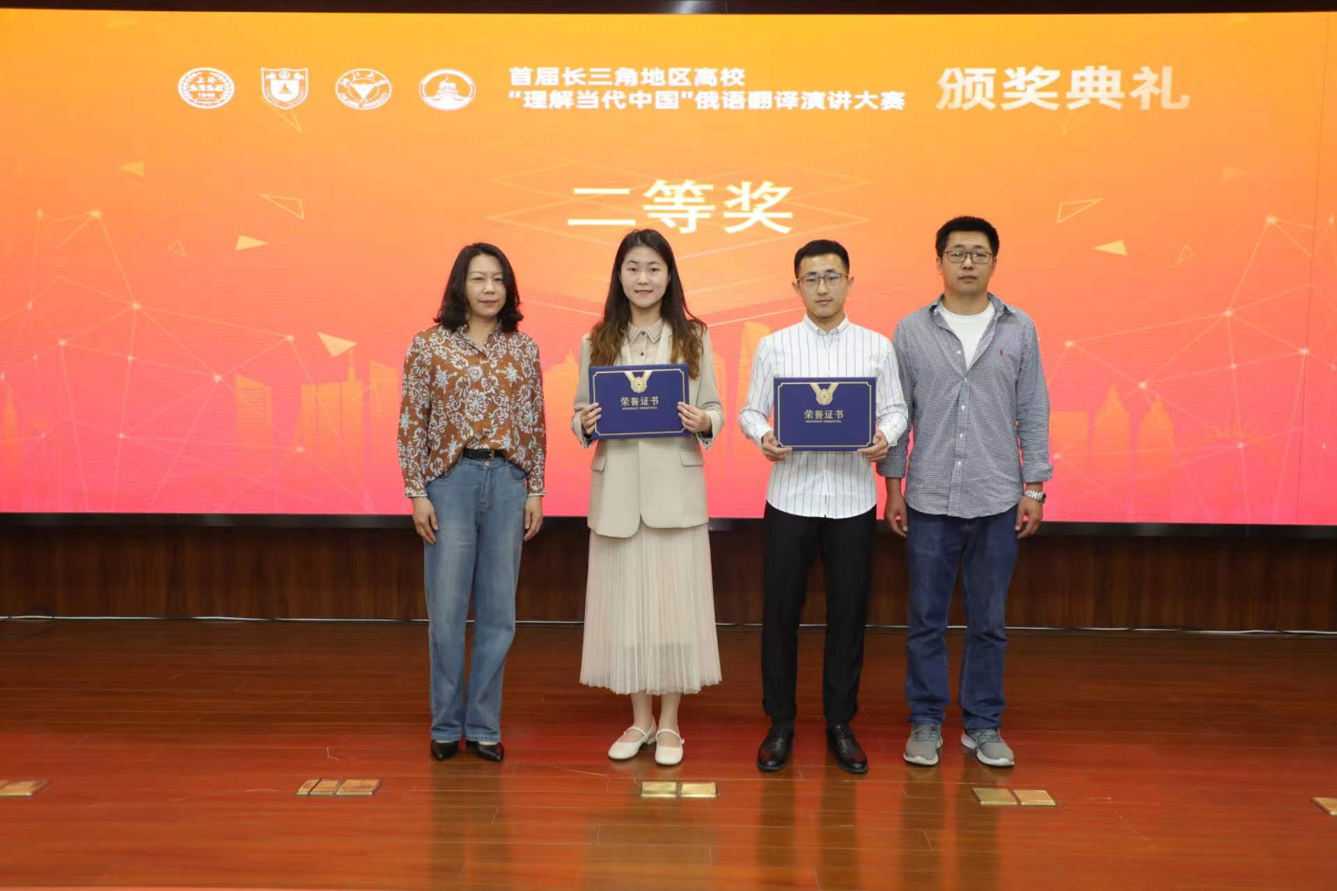 开幕式后,激烈的复赛、决赛正式开始。复赛包括命题演讲和阅词会话两个环节,决赛为口译形式,包括俄译汉和汉译俄。经过激烈比拼,外国语学院俄语专业参加低年级组的李飞逸同学稳定发挥,荣获三等奖。在初赛环节,俄语专业高年级组张继然同学获得大赛优秀奖。此次获奖是我院俄语专业继2017年大赛获得三等奖,2018年获得优秀奖后,时隔4年同时获得三等奖和优秀奖。在颁奖环节,2022年首届长三角地区高校“理解当代中国”俄语翻译演讲大赛颁奖典礼同时举行。该项赛事由来自华东地区的复旦大学、南京大学、浙江大学、上海外国语大学、华东师范大学等30余所高校参加,经过初赛和复赛的激烈角逐,外国语学院俄语专业的仇慈爱荣获一等奖,张继然获得二等奖,周颖获得三等奖,邢阳获得优秀奖。