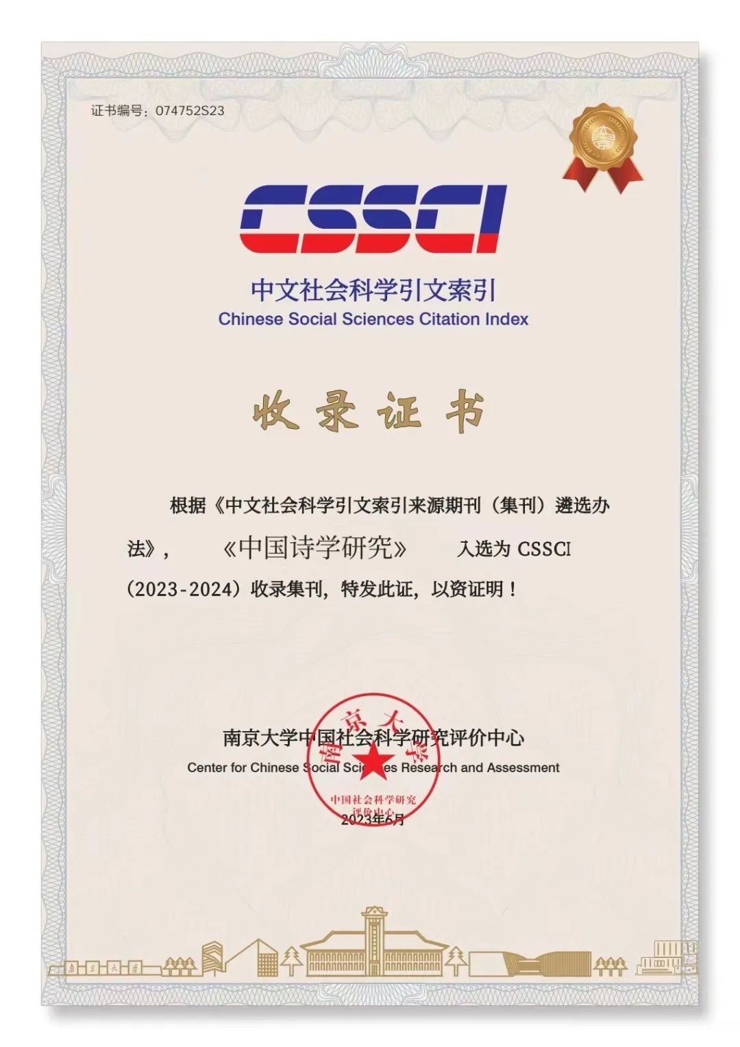 近日,安徽师范大学中国诗学研究中心接到南京大学中国社会科学研究评价中心信息,《中国诗学研究》成功入选CSSCI(2023-2024)收录集刊。
